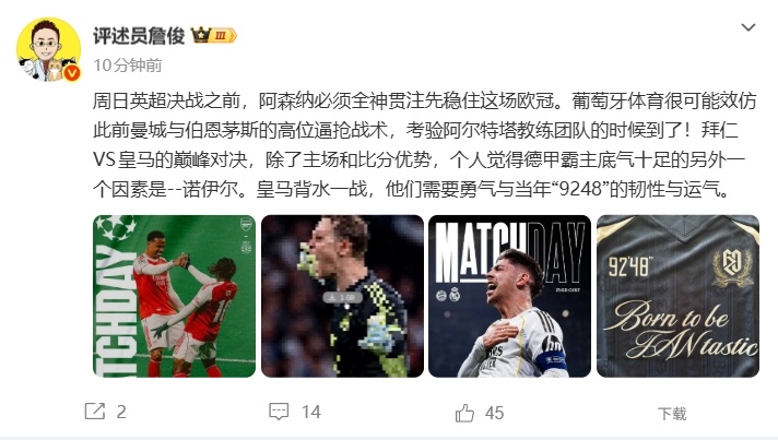 知名评述员詹俊在社媒发文,谈到今晚的两场欧冠比赛。