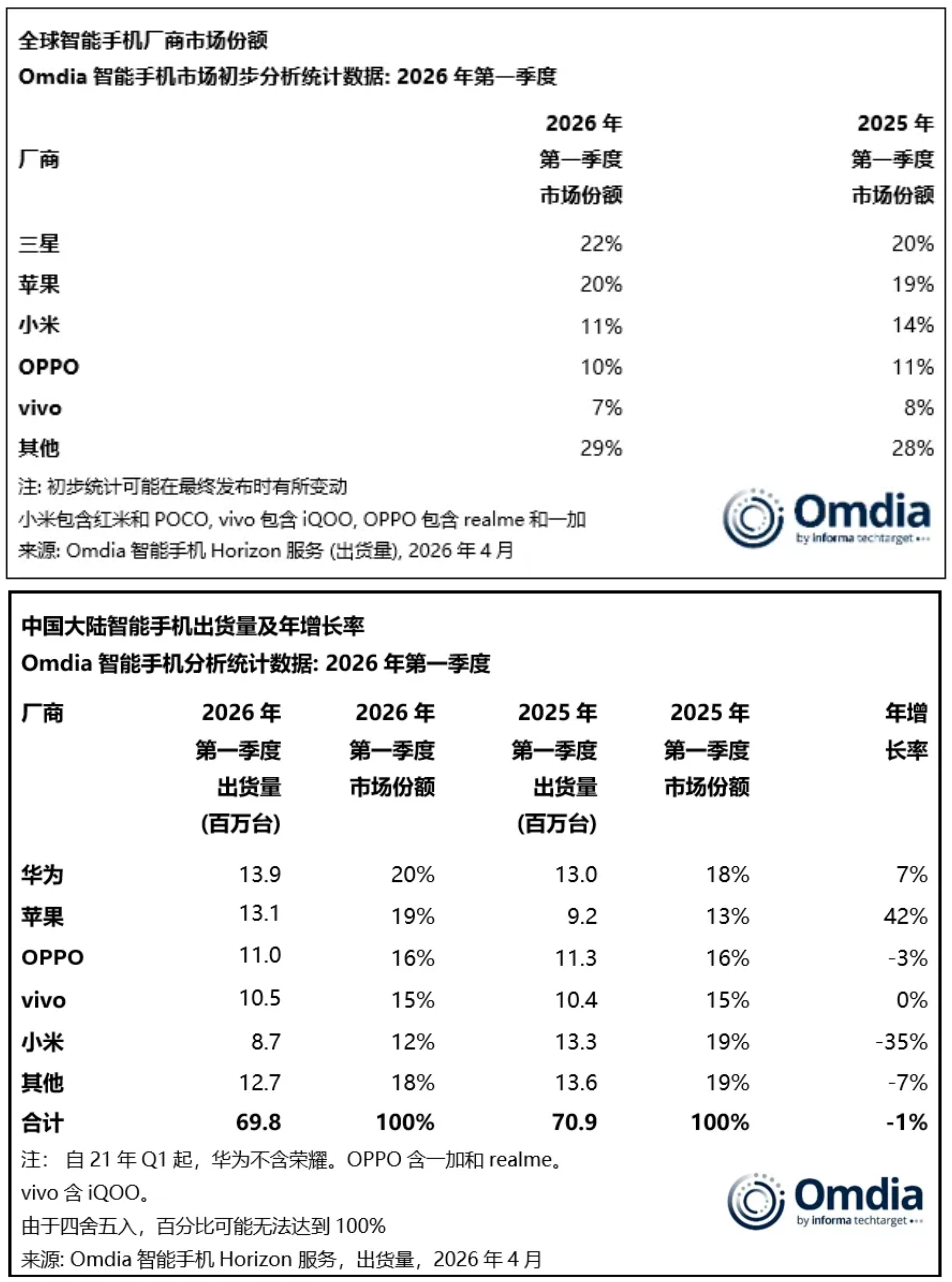 Omdia:全球TOP5——三星、苹果、小米、OPPO、vivo中国TOP5——华为、苹果、OPPO、vivo、小米
