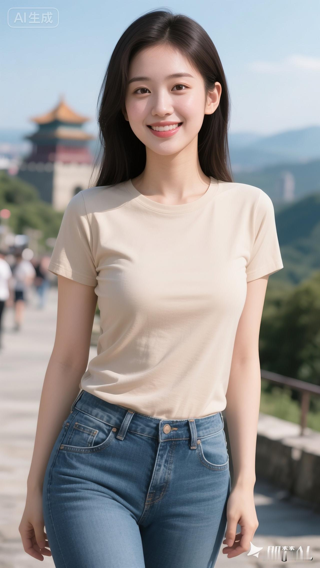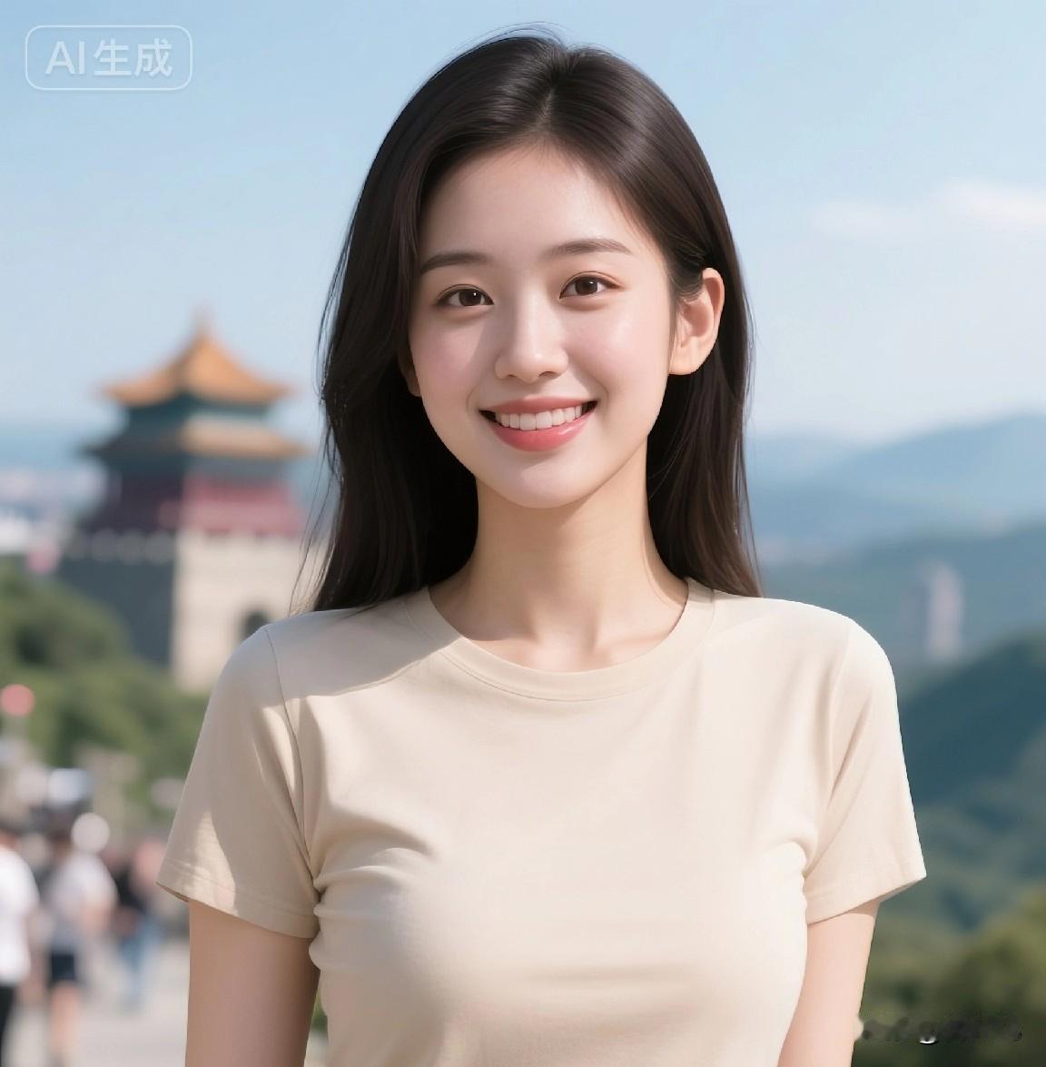 她亭亭立于山前,乌发如瀑,眼眸倒映着青峦。阳光轻抚她的轮廓,仿佛她本就是这自然生