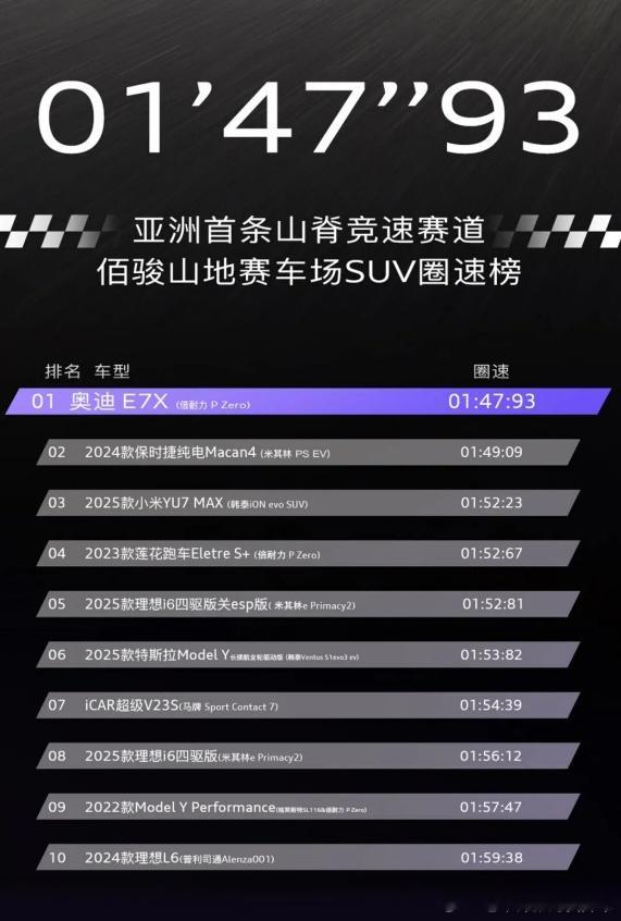 第二是强操控,E7X还是侧重打造了自己的性格,相比中国品牌更强调舒适,E7X选择对操控极致开发,没有妥协。近期很多媒体报道了,在亚洲首条山脊赛道挑战中,奥迪E7X以量产SUV登顶了SUV榜单。尽管这个比赛本身比较小众,甚至奥迪对外公布时隐去了比赛的名字。但这不重要,我们主要是看竞争对手和成绩。第二是奥迪同门兄弟保时捷Macan EV,第三是小米YU7 MAX,第四是莲花也就是之前的路特斯。可以说2-4名都是很强调操控的品牌。