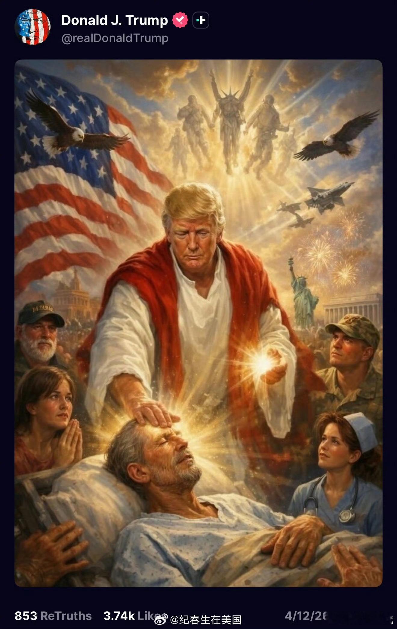 特朗普因为发自己化身耶稣的ai照片而饱受攻击,又有网友制作图片来救他。特朗普称对伊朗战争结束伊朗美伊以冲突