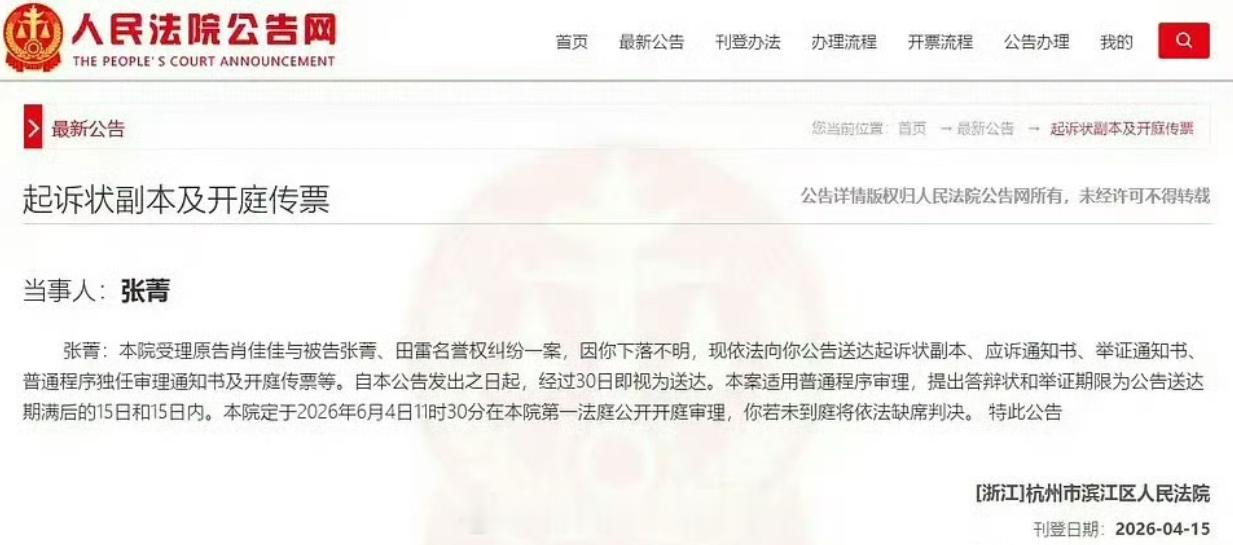九成美默不作声,把田栩宁和若若告上法庭了。现在若若下落不明,法院发出公告,要求她6月出席,公开庭审。