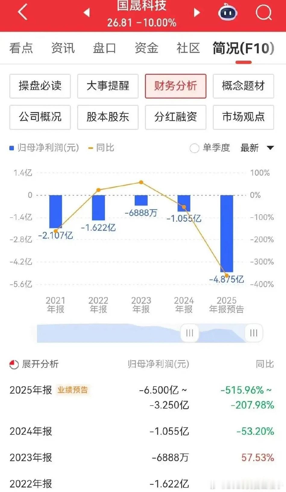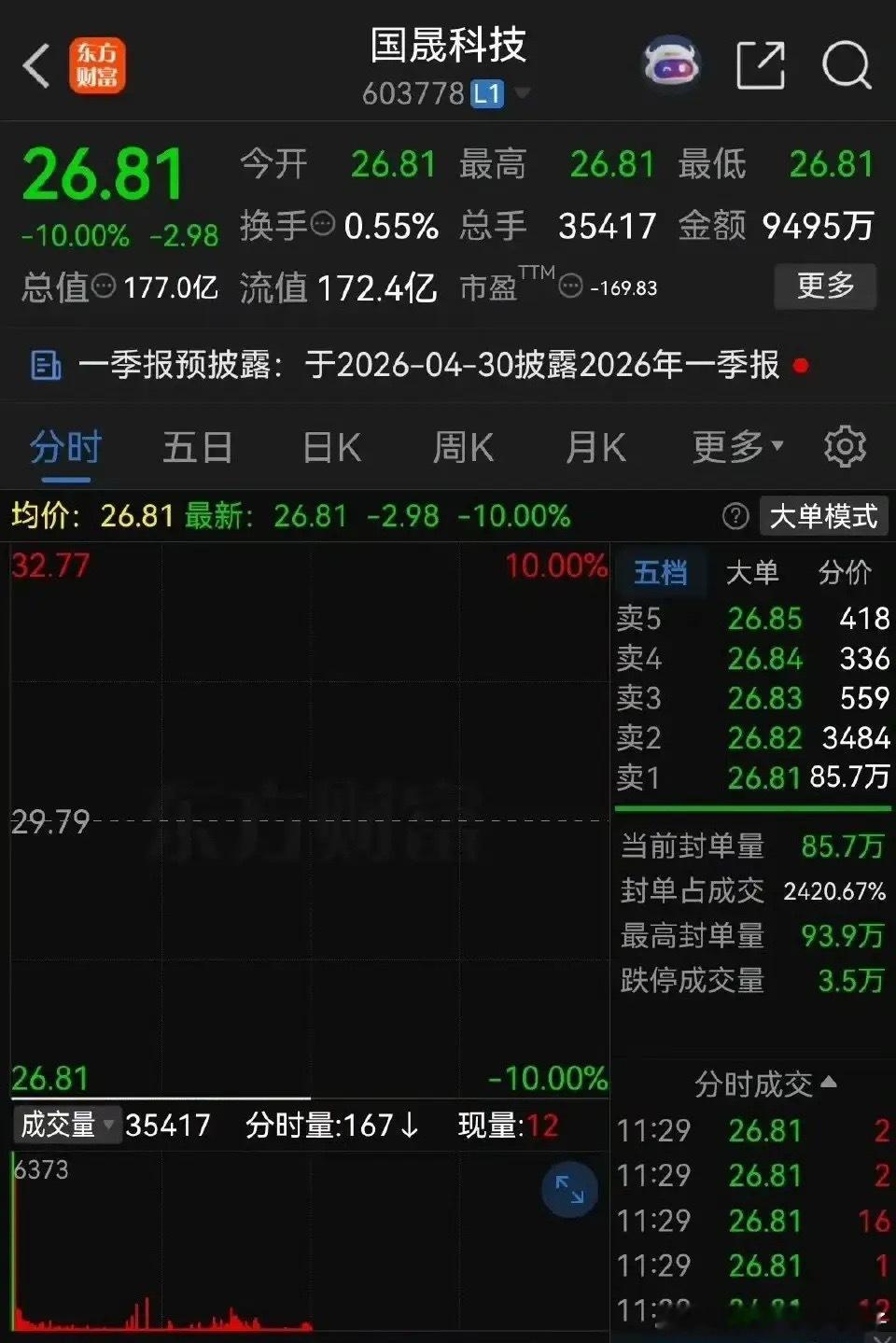 说真的,国晟科技这两天的走势,看着都替那些高位进场的朋友心疼。周一晚间公司公告,2.4亿的收购终止。昨日开盘一字跌停,百万手封单承压,今日再度跌停。截至上午收盘,股价26.81元,跌停板仍有85万手卖单,暂无开板迹象。这家公司已连续六年亏损,累计亏损近13亿元。但股价自去年9月3元附近一路上行至34元上方,半年涨幅较大,基本面未发生明显改变,市场炒作氛围较浓。即便那笔收购落地,股价大幅上涨也已充分透支预期。高位追入的投资者,需承担较大波动风险。从走势看,一月见顶回调后再度拉升创新高,资金获利了结意愿较强,高位接盘风险凸显。市场波动本就无常,普通散户更应注重风险,守住本金至关重要。股票交流股市分析