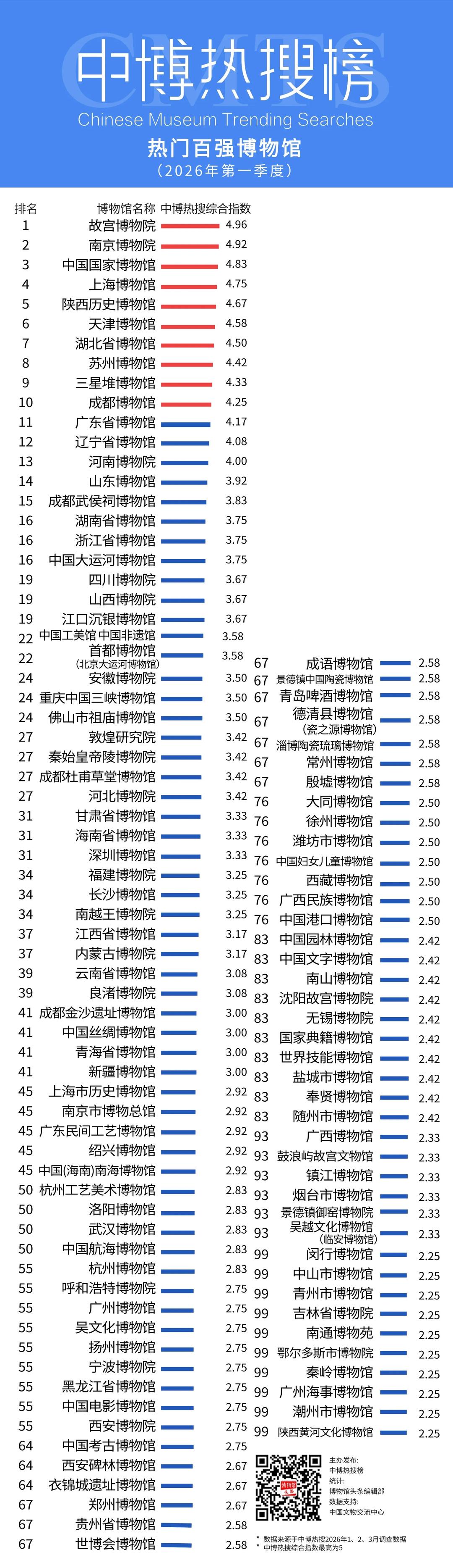 日前,“中博热搜榜”发布《2026年第一季度全国热门博物馆榜单》(中国文物交流中心数据支持)。其中,山东博物馆、青岛啤酒博物馆、淄博陶瓷琉璃博物馆、潍坊市博物馆、烟台市博物馆、青州市博物馆等6家博物馆榜上有名。