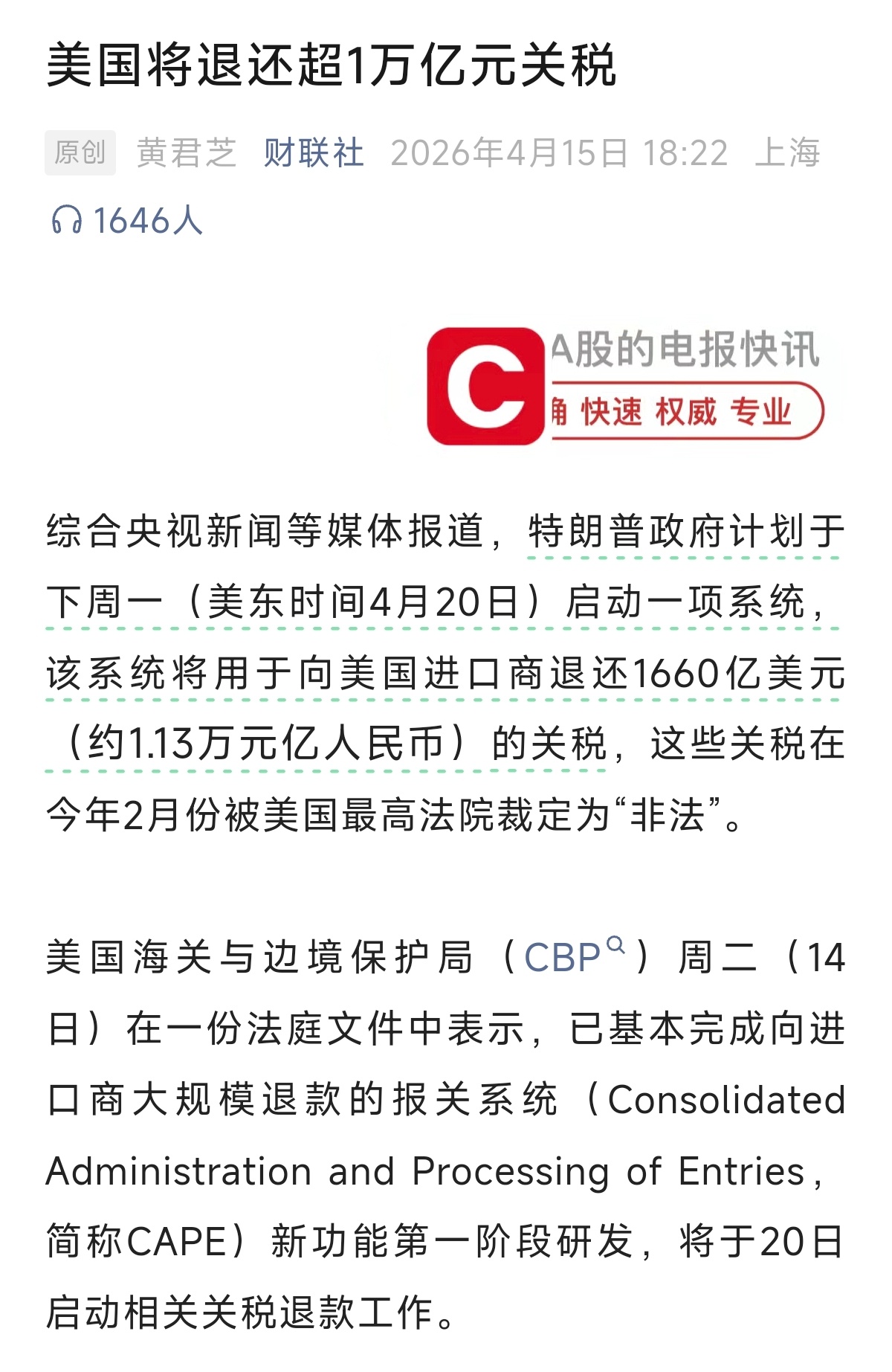 这个加征关税还真能退啊?不过按照谁缴纳退回给谁的原则,大部分受益还是在美的进口商。国内的供货商如果在美国没有进口公司的话,也只能看着。美国将退还超1万亿元关税