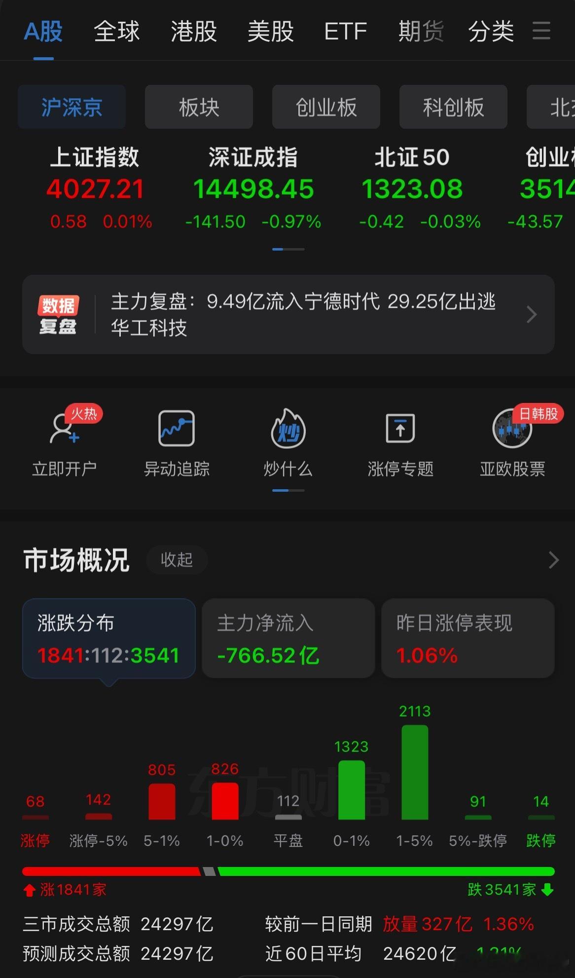 周三指数高开低走,深成指跌近1%。沪深两市成交额2.42万亿,较上一个交易日放量315亿。