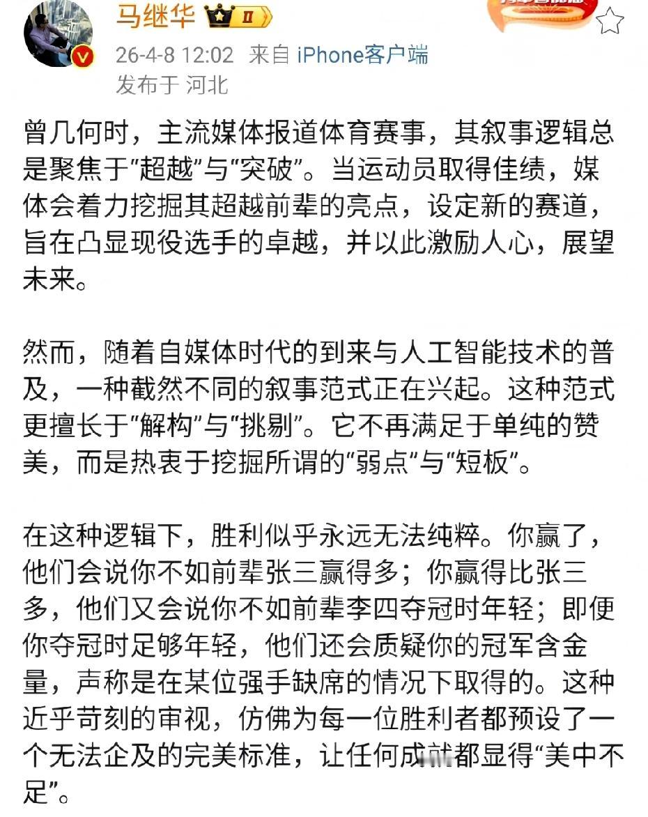 马老师是我的互联网嘴替 一针见血,总结到位 我们必须要承认啊 每个时代都有属于各自时代的英雄 不能总是拿这个比拿那个比 你说张三他又说李四 你说李四他又说赵五 反正他们就是“常有理” 嫉妒会让人面目全非,其实贬低他人的优秀同时也会贬低自己,优秀不是靠贬低他人衬托出来的,优秀的人才能看见别人的优秀! 真的是人心不古,自己达不到还评价别人的不完美!每个运动员都不容易,我们都望尘莫及啊! 至少他们在自己的那个领域里,已经是佼佼者,试问我们又在自己的领域处于什么水平呢? 希望所有运动员都被尊重,竞技体育已经很残酷了,其他人就不要给他们添乱了! 朋友们,你们说是不是? 记录我的2026 乒乓球
