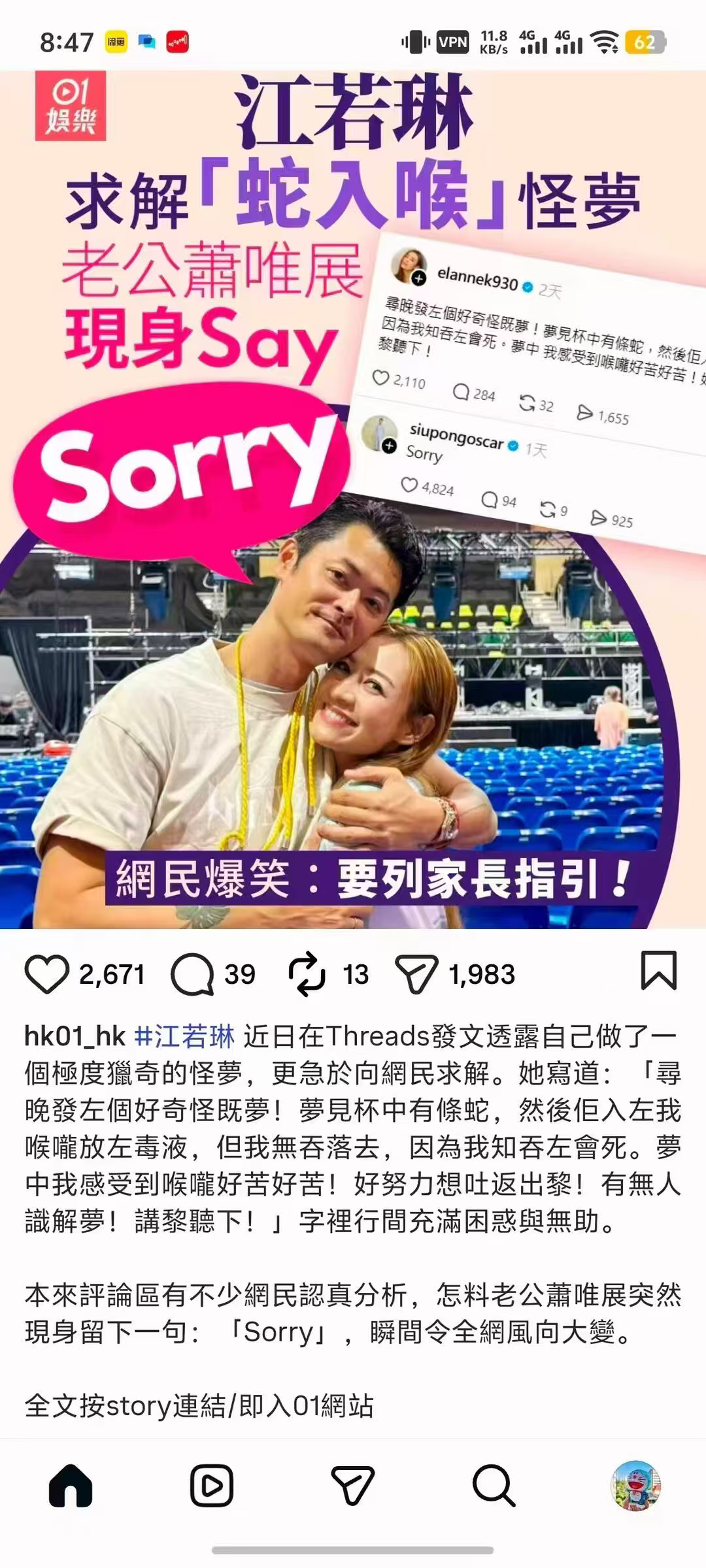 秦岭笑谈江若琳噩梦变夫妻情趣江若琳在社交平台分享惊悚怪梦:梦里杯子里的蛇钻进喉咙释放毒液,喉咙剧痛无比,满心困惑发帖求助网友解梦。原本全网都在认真玄学解梦,氛围阴森又诡异,结果老公萧唯展空降评论区一句轻飘飘Sorry,直接一秒破功😂惊悚解梦现场瞬间变成暧昧拉满的夫妻私密调情,画风急转直下又甜又上头,离谱反差笑点直接拉满。网友集体爆笑:这剧情必须加家长指引,成年人的浪漫真的太好嗑!江若琳 萧唯展娱乐圈搞笑名场面