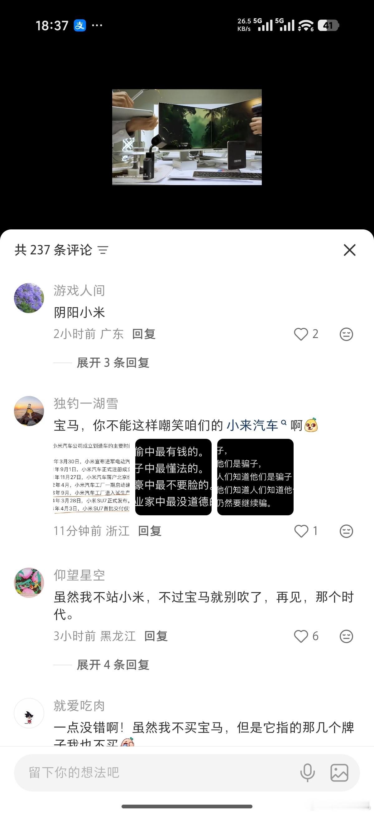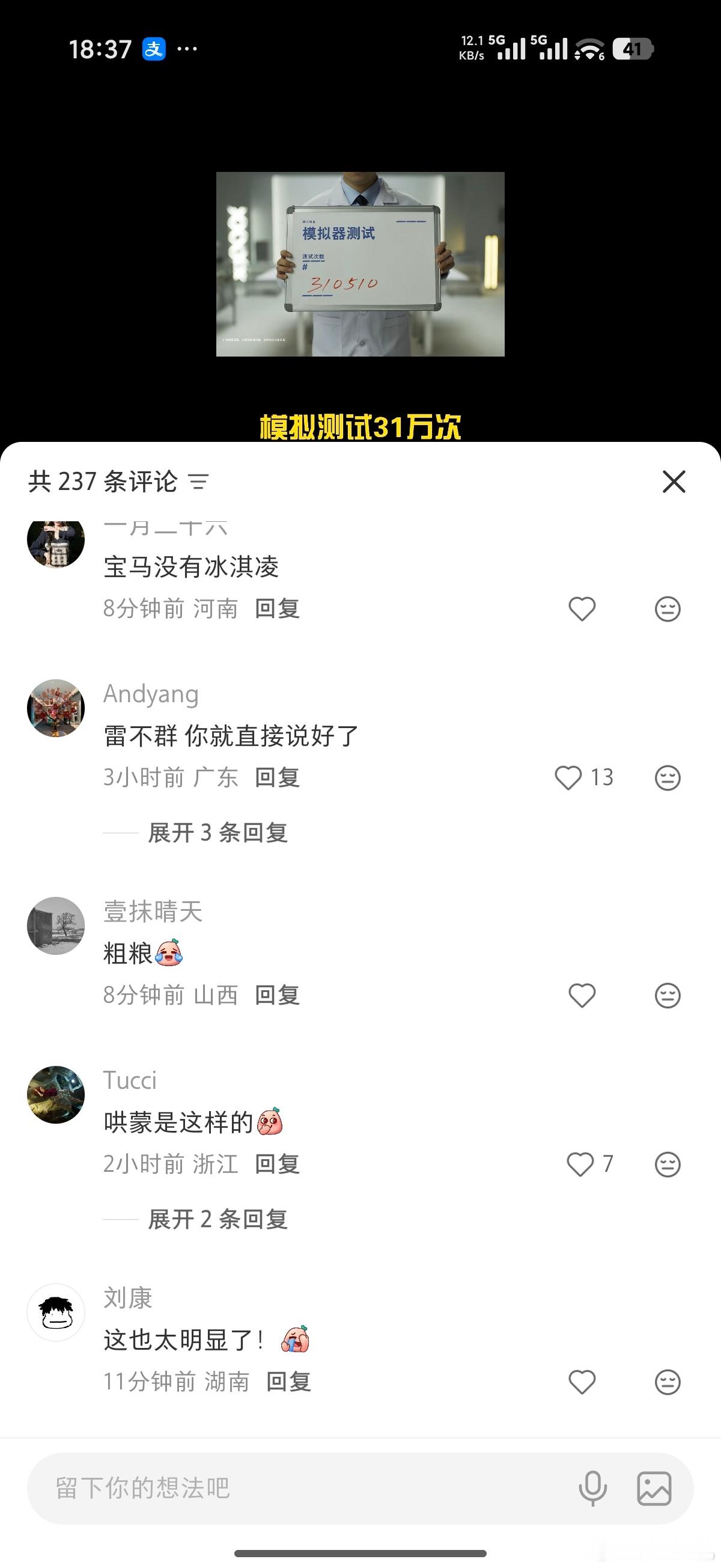 真的小米又莫名其妙躺枪了,宝马发了一个嘲讽新能源品牌的广告,暗讽某些车企车还没造出来就已经开始吹了,然后评论区一堆人把矛头指向小米,很明显这次宝马暗讽的是某些车企,但肯定不是小米,毕竟小米不会吹路测千万公里,路上还看不到车,也不会拿ai测试来宣传,米子可是实实在在去跑纽北跑赛道,成绩都看得见。所以大家觉得宝马到底在暗讽谁?数码科技评论