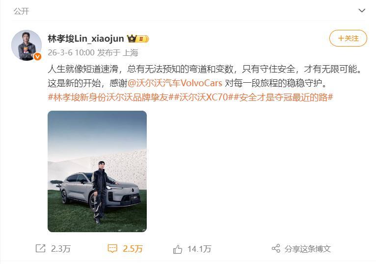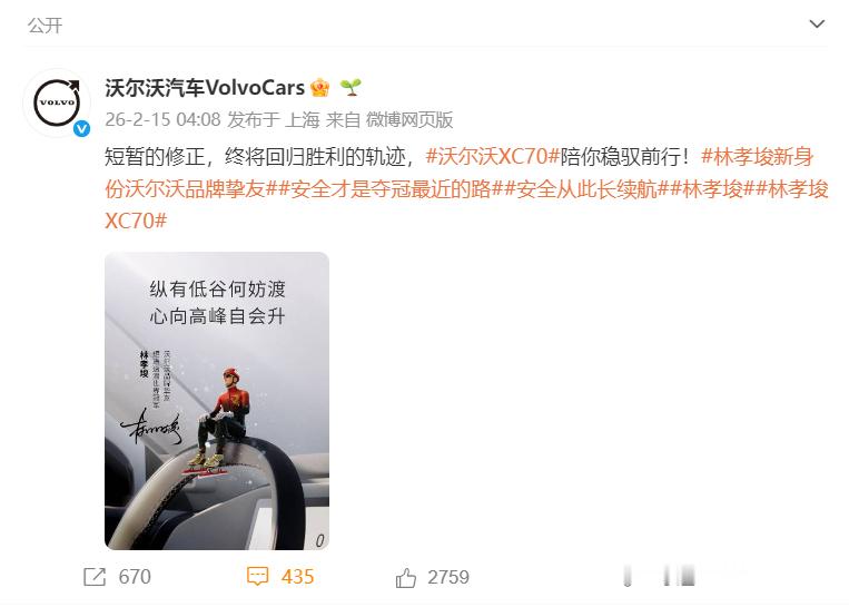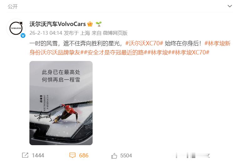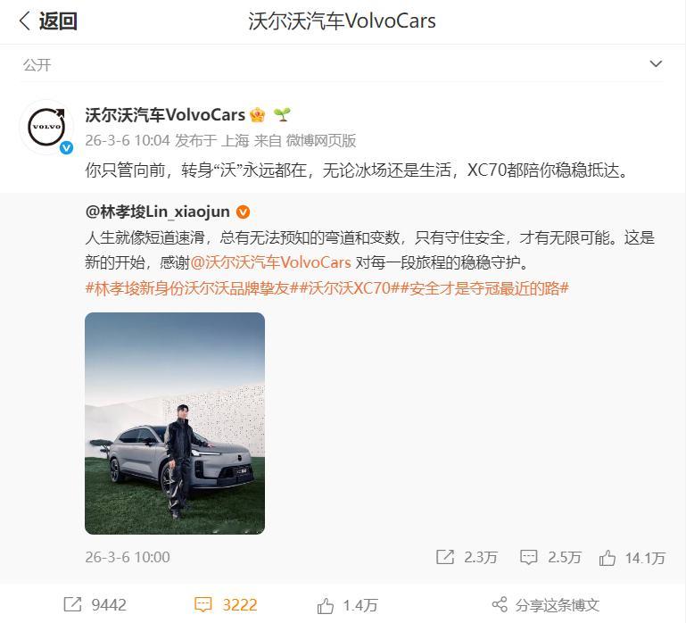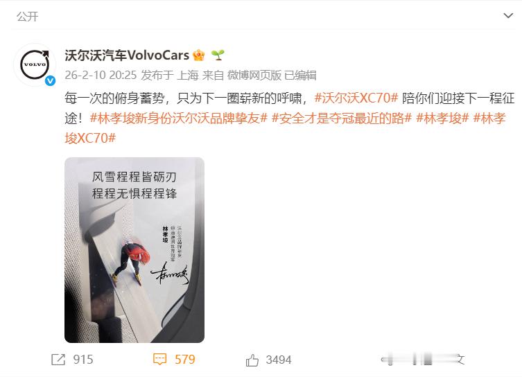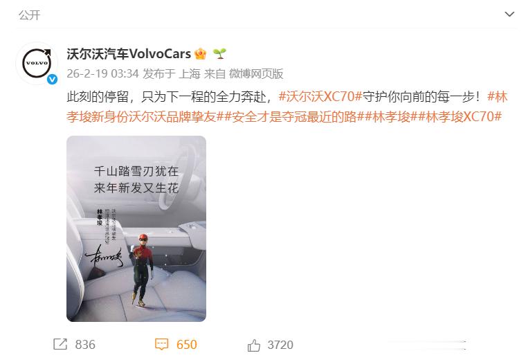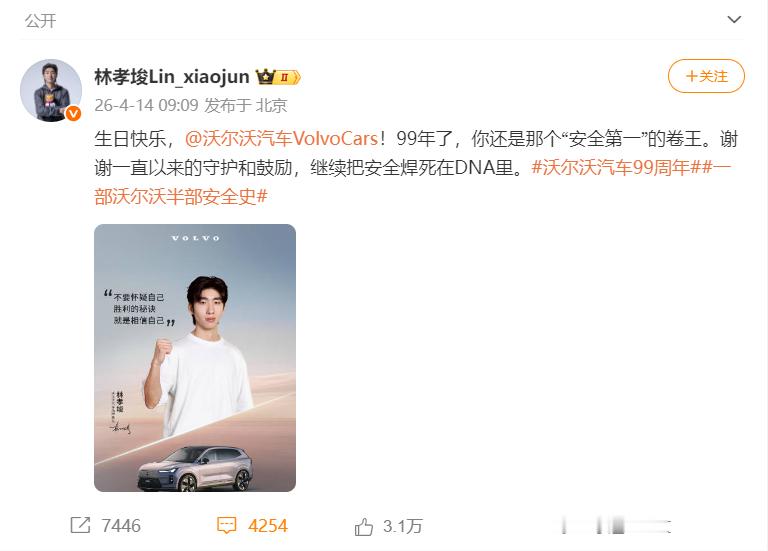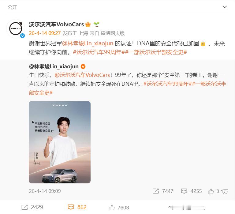 “生日快乐,沃尔沃汽车VolvoCars!99年了,感谢你一路的守护与鼓励。”林孝埈的这份祝福,是冰上王者对安全“卷王”的回响。冬奥期间沃尔沃为他打气,如今他送出生日祝愿——这不是单向感谢,而是双向奔赴。一个把安全焊进DNA,一个把稳刻进每次滑行;价值观共鸣,才是最好的并肩。