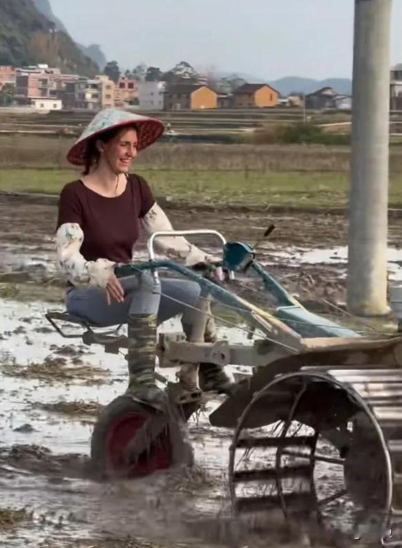 2018年,21岁意大利美女与27岁广西农村小伙结婚生子。令人意外的是,在结婚后,这位原本举止优雅的意大利少女竟然渐渐迷上了干农活。她不但学会了插秧、刨地等农活,就连开拖拉机犁田也得心应手。 广西南宁的乡村田埂上,拖拉机的轰鸣声打破了午后的宁静。 金发碧眼的意大利姑娘美纳斯正熟练地握着方向盘,犁铧翻开泥土,带着稻香的湿热气息扑面而来。 她的裤脚沾满泥点,额头沁出细汗,嘴角却挂着一个满足的弧度——比托斯卡纳的艳阳还要明媚。 谁能想到,这个干起农活比村里小伙还麻利的姑娘,几年前还是意大利养尊处优的富家千金。 她扎根这片土地的原因,不过是在一次国际读书会上,爱上了一个土生土长的广西农村小伙卡农。 2018年,21岁的美纳斯与27岁的卡农在珠江边一家图书馆的双语读书会上相遇。 她是游学中国的意大利富商之女,精通多国语言,足迹遍布欧美非,他是来自广西南宁马山县的农村小伙,中专辍学后辗转打工,靠着自学英文歌练出一口"散装英语",最终成为一名摄影师。 两个世界的人,因为对语言和文化的共同热爱,碰撞出了火花。卡农用翻译软件笨拙地表达心意,美纳斯则被他骨子里的真诚与质朴打动。 相识、相恋、结婚,一切快得像是命运的推手——没有奢华的排场,只有整个村庄的祝福。 初到广西农村,美纳斯连最基础的农具都叫不上名字。 乡亲们私下嘀咕:这外国姑娘细皮嫩肉的,怕是待不了多久就要回去。 然而美纳斯用行动让所有质疑闭上了嘴。 她跟着婆婆下田,弯着腰学插秧,一株一株比对间距,摔进泥地里也不恼,爬起来拍拍围裙继续琢磨。 刨地时手心磨得通红起泡,她贴上创可贴,第二天照样扛着锄头出门。 最让人称奇的是学犁田。 她盯上了邻居大伯的铁耙犁,天天蹲在田埂上"偷师",软磨硬泡求着教。 大伯拗不过她,手把手示范了几回——没想到这洋媳妇悟性极高,几个来回就上了手,推着铁耙在泥水里健步如飞,溅了满身泥点子却笑得合不拢嘴。 从铁耙犁到手扶拖拉机,从插秧刨地到收割稻谷,美纳斯样样精通。 她甚至学会了用广西传统的少数民族背带——把孩子稳稳绑在背上,腾出双手干活,忙完了就背着娃在村口等丈夫收工。 泥巴里开出的玫瑰,从来不需要温室的庇护。 她用沾满泥土的双手证明:真正的归属感,不是地理位置的迁移,而是心灵找到可以扎根的土壤。爱情跨越了山海,而她在广西的红土地上,活成了自己最美的模样。
