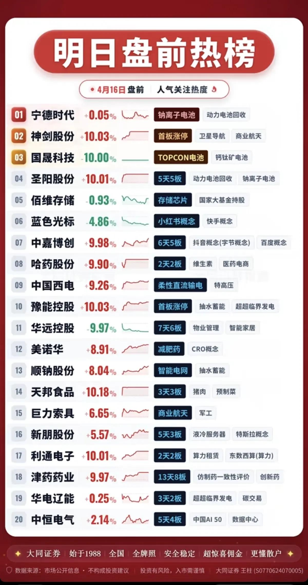 明日盘前热榜出炉,市场风格悄然生变,机遇与风险正加速分化。 津药药业13天8板的惊人表现,再次点燃短线情绪,但华远控股7天6板后跌停,国晟科技、蓝色光标等前期热门股资金出逃,高位股筹码松动风险加剧,追高需格外谨慎。 盘面主线愈发清晰,新能源与AI双轮驱动。圣阳股份5天5板领涨,顺钠股份、中国西电等电力设备股集体爆发;利通电子、中恒电气等算力租赁概念股延续强势,钠离子电池、TOPCON电池等细分赛道热度攀升。 消费医药板块异动明显,天邦食品3天3板领涨预制菜,美诺华减肥药概念涨8.91%,板块轮动节奏加快。 当前市场连板潮与分歧信号并存,明日需重点关注连板股承接力,以及新能源、AI主线的持续性,警惕高标股回调风险。投资有风险,入市需谨慎。