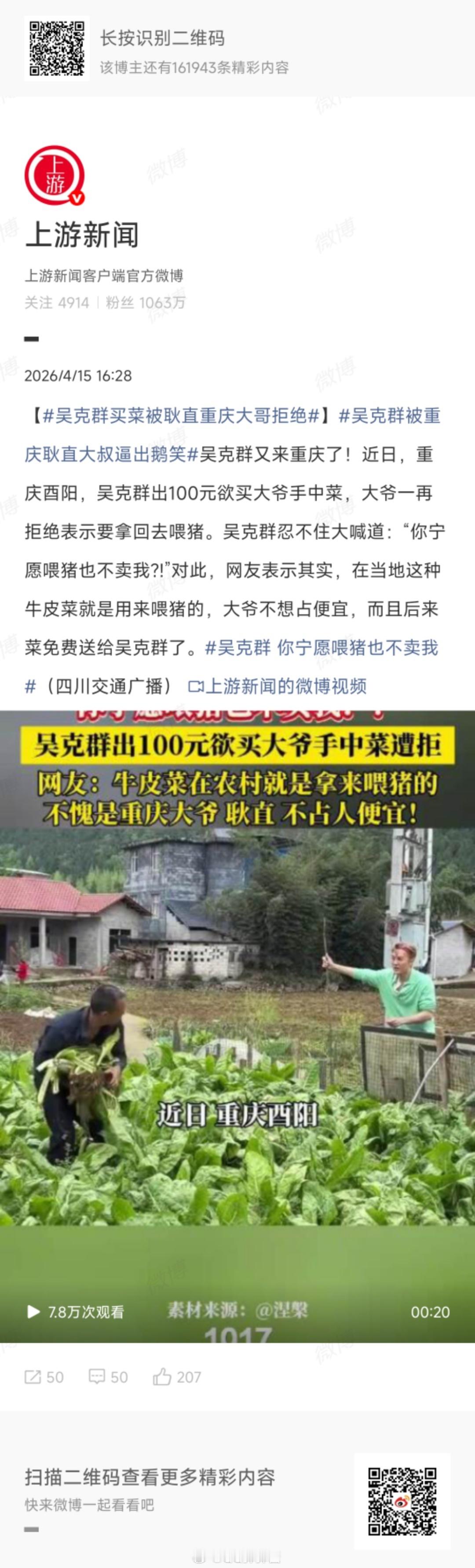 吴克群买菜被耿直重庆大哥拒绝吴克群被重庆耿直大叔逼出鹅笑吴克群在重庆想花钱买菜,重庆大哥超耿直,直言菜是喂猪的不卖,直接把吴克群逗得笑出鹅叫,又搞笑又接地气!