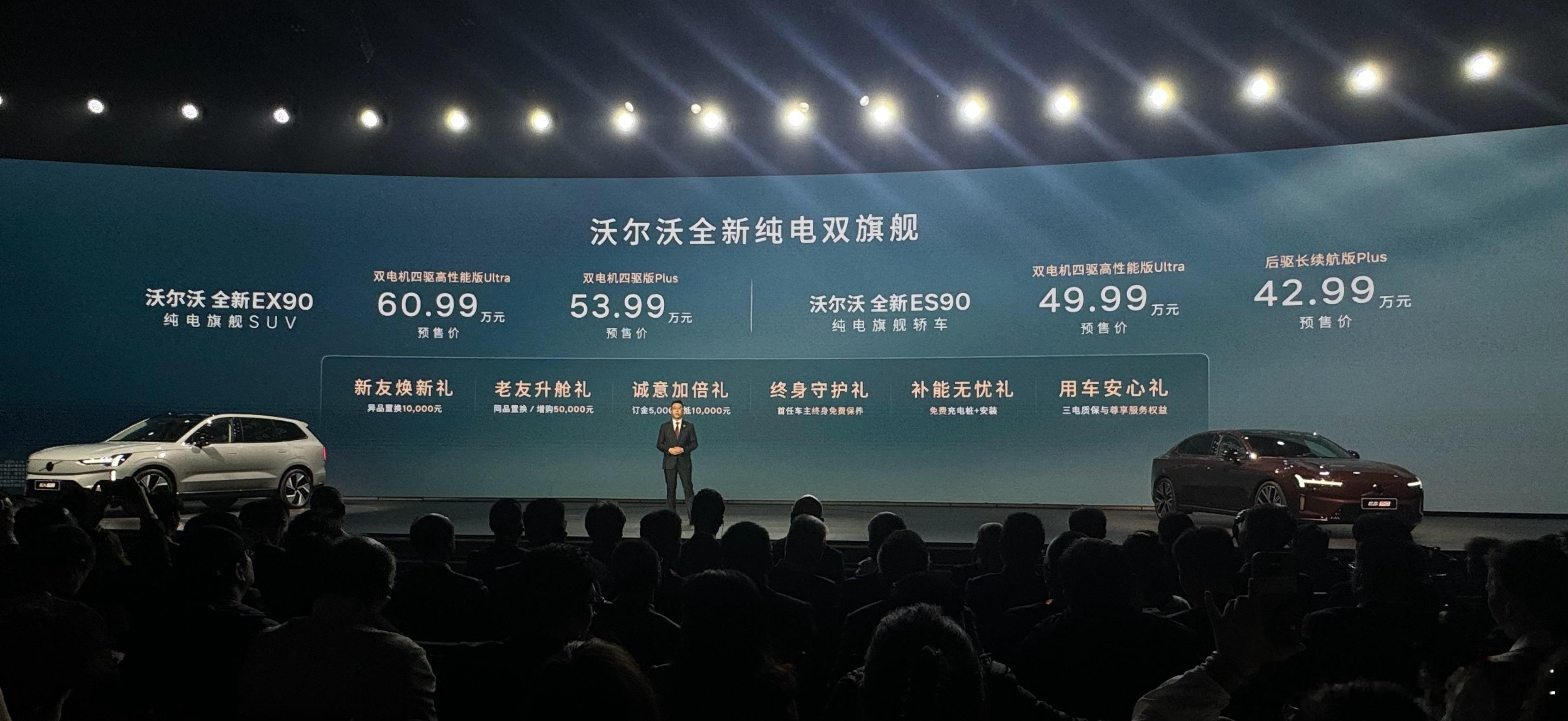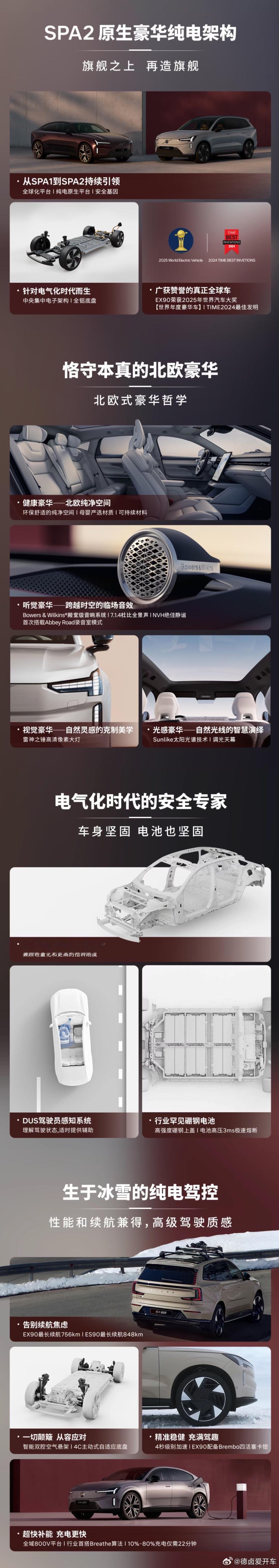 沃尔沃EX90与ES90同步开启预售:- EX90预售价53.99万-60.99万元,- ES90预售价42.99万-49.99万元;沃尔沃纯电双旗舰开启预售两款车型均基于SPA2原生豪华纯电专属平台打造,搭载800V高压架构。