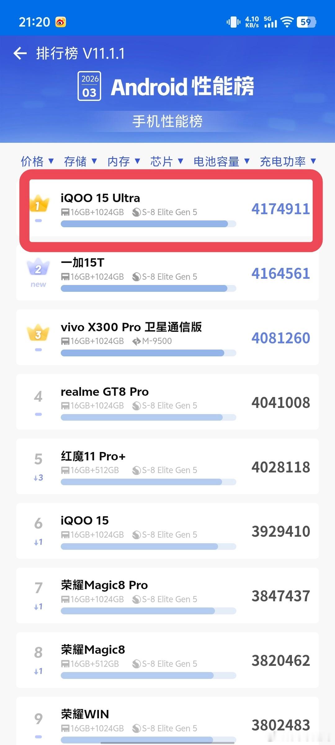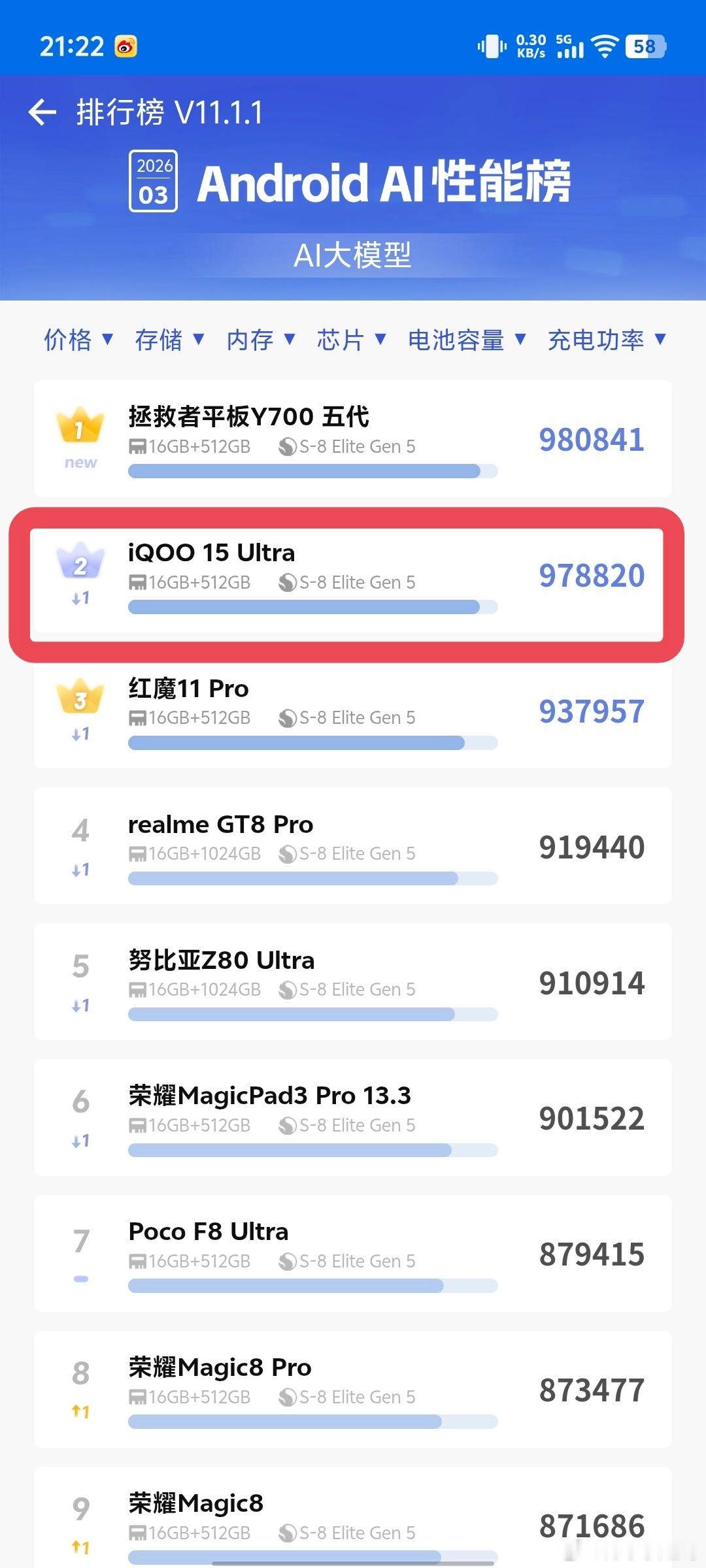 iQOO15 Ultra刚刚去安兔兔排行榜里面看了一圈,没想到到处都是 iQOO 15Ultra!