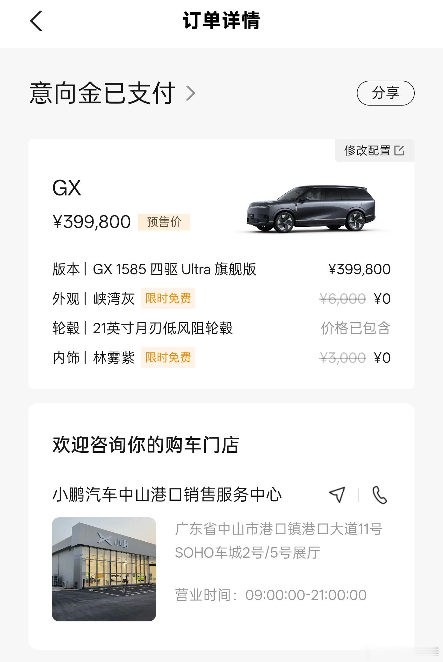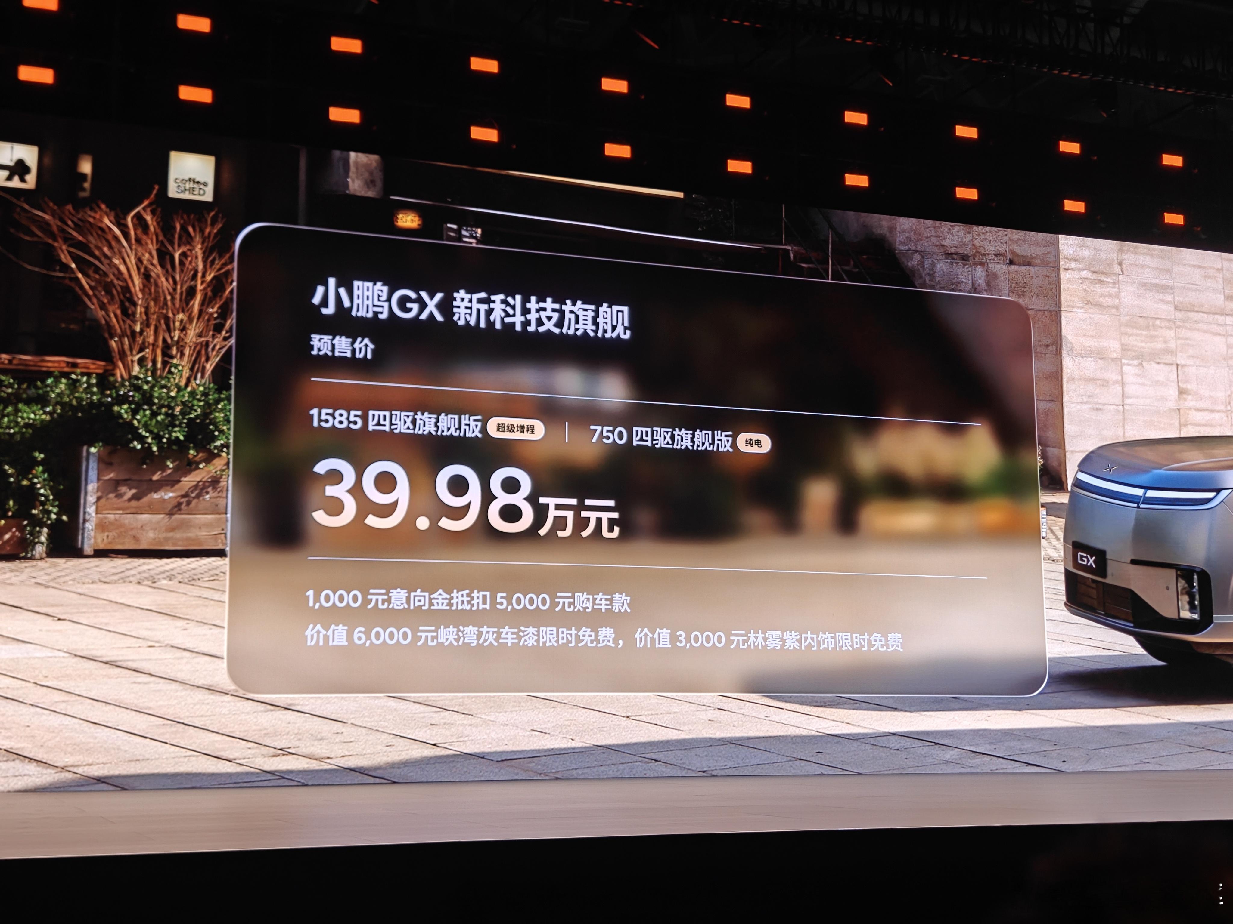 顶配旗舰预售价39.98万。我觉得这个应该不是ROBO版本,ROBO版本肯定是单独有一个售价!那依次往下估计还有2个配置预计是各低2万,加上正式售价会比预售价低1-2万。参考X9的售价,考虑到GX配置更高且全系四驱,那估计正式售价的版本是:纯电版本33.68(680续航版本),顶配37.98-38.68增程版本31.68起售价,顶配34.98-35.68。主要是看类似于AI隐私玻璃,电动踏板,DLP大灯,副驾驶零重力这几个是不是要选配当前预售界面只有轮毂和内外颜色有选装小鹏汽车新科技旗舰小鹏GX预售39.98万