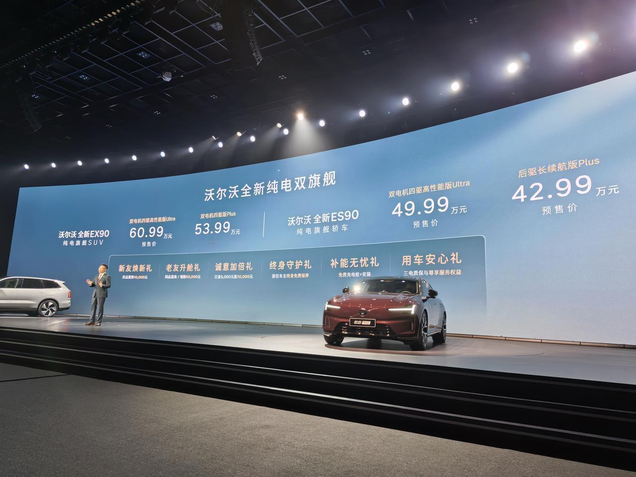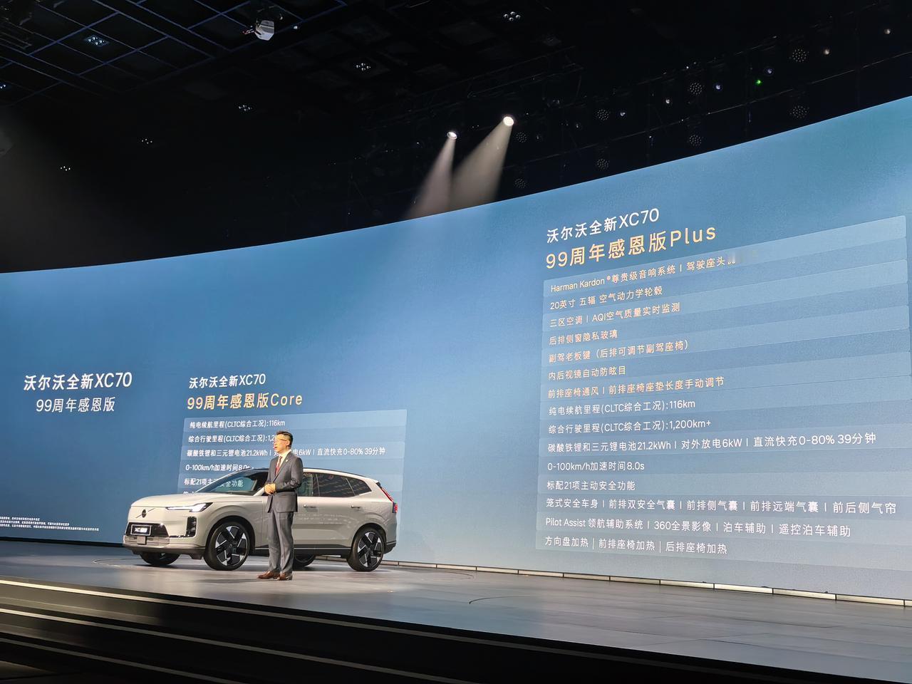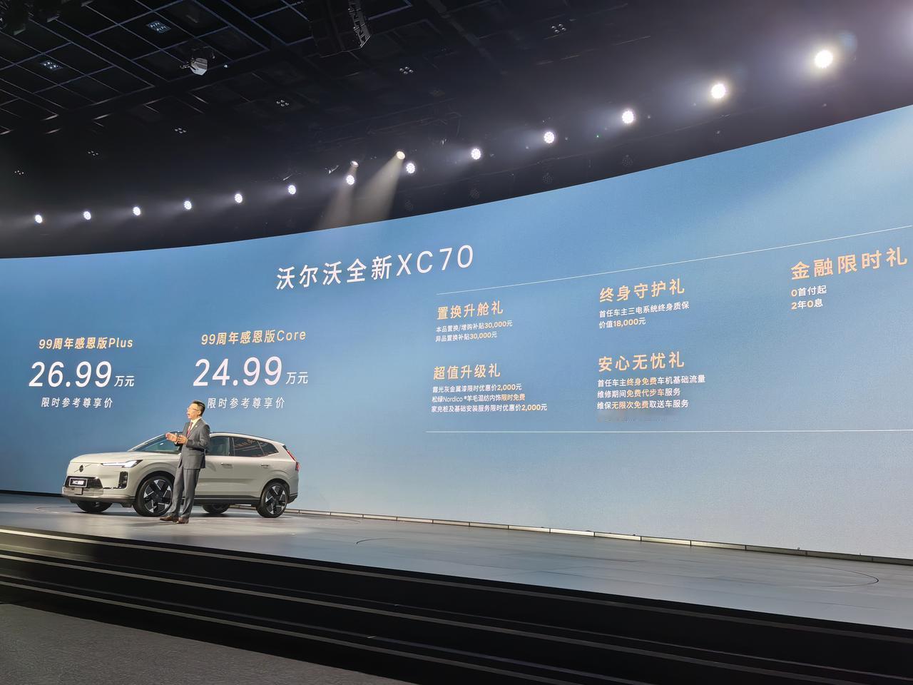 沃尔沃99周年发布会,三剑齐发,两款纯电旗舰ES90和EX90开启预售,ES90预售价42.99万起,EX90预售价53.99万起,还有6重限时权益。全新XC70的99周年感恩版,售价24.99万起,5重限时权益,配置上图了。 简单聊聊亮点,两台新车设计很讨巧不花哨重本质,能把高级感带到车内车外,756km和848km两版续航,充电10分钟,补能300km。 ES90有世界树安全体系和第二代笼式车身,电车定制版本,硼钢电池包,硬刚80吨压力测试,强度够扎实,中大型豪华纯电轿车,车身修长流畅,后排空间很顶,座椅用环保材质,还配备电变色天窗、宝华韦健7.1.4音响等实用配置。 EX90定位中大型纯电SUV,同样的安全标准,提供6座和7座布局,适合家庭出行,行李厢容积灵活。带激光雷达和双Orin芯片,25个传感器盯着,安全感满满,同时也兼顾豪华和省电的特性。我们拍了视频,大家可以近距离感受感受这种北欧风情。 现场还把一台35米高空自由落体的XC70挪到现场,车体完整、A柱无变形,很震撼的测试。说真的,沃尔沃这99年是真的专一,1927年到现在,眼里始终把安全放第一位,从三点式安全带无偿公开,到现在纯电时代的体系建设,实实在在做防护。 现场还看到了郭晶晶,十年老车主台上谈经验,买车就是求稳求踏实,很信赖沃尔沃的产品!这话真的说到心坎里了,和沃尔沃的理念太搭,不管是开车还是做事,稳和安全才是底线,这也是沃尔沃99年一直坚持的。【来自懂车帝车友圈】