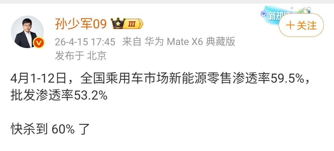 孙少军:4月1-12日,全国乘用车市场新能源零售渗透率59.5%,批发渗透率53.2%,快杀到 60% 了! 现在的油价这么高,很多人在购买新车或者换车的时候,就会优先考虑新能源汽车,其使用成本也会推动消费者新能源汽车。 其次一点是新能源汽车在产品智能化方面,相比较油车有着非常大的优势,很多新能源产品的智能化水平与传统油车相比,就相当于智能手机和功能机的区别。
