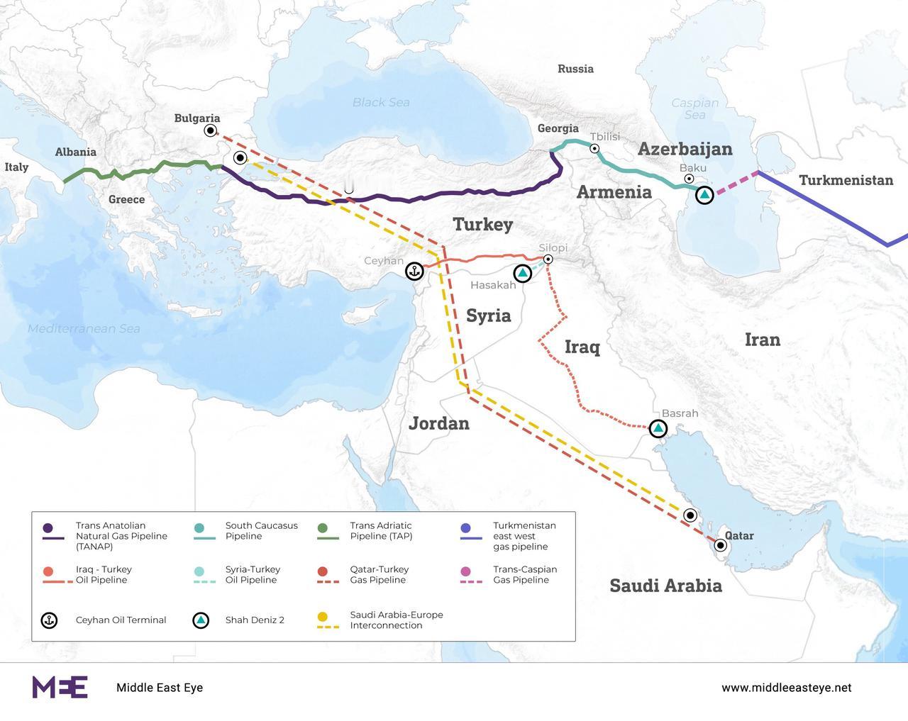 土耳其共和国提议建设新的能源线路,原因是霍尔木兹海峡局势紧张。 在霍尔木兹海峡危机期间,土耳其提出多项新的能源管道项目:1. 卡塔尔-土耳其天然气管道;2. 跨里海天然气管道;3. 叙利亚-土耳其石油管道;4. 巴士拉-土耳其石油管道;5. 沙特阿拉伯-土耳其互联管道。