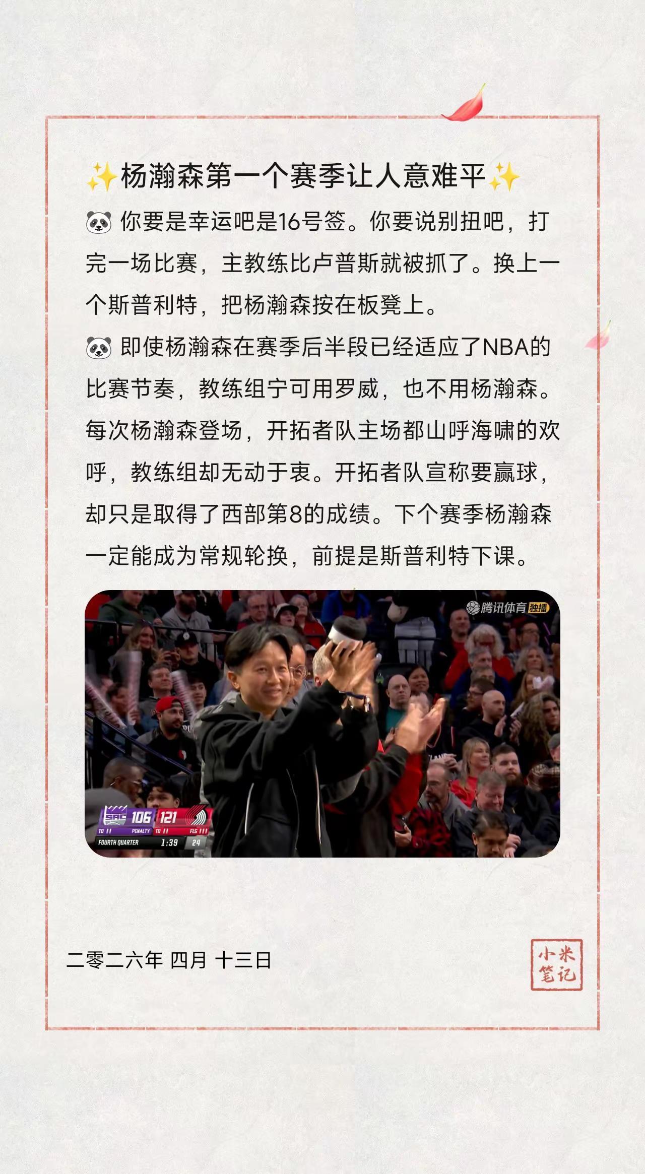✨杨瀚森第一个赛季让人意难平✨。🐼 你要是幸运吧是16号签。你要说别扭吧,打完一场比赛,主教练比卢普斯就被抓了。换上一个斯普利特,把杨瀚森按在板凳上。🐼 即使杨瀚森在赛季后半段已经适应了NBA的比赛节奏,教练组宁可用罗威,也不用杨瀚森。每次杨瀚森登场,开拓者队主场都山呼海啸的欢呼,教练组却无动于衷。🐼 开拓者队宣称要赢球,却只是取得了西部第8的成绩。下个赛季杨瀚森一定能成为常规轮换,前提是斯普利特下课。