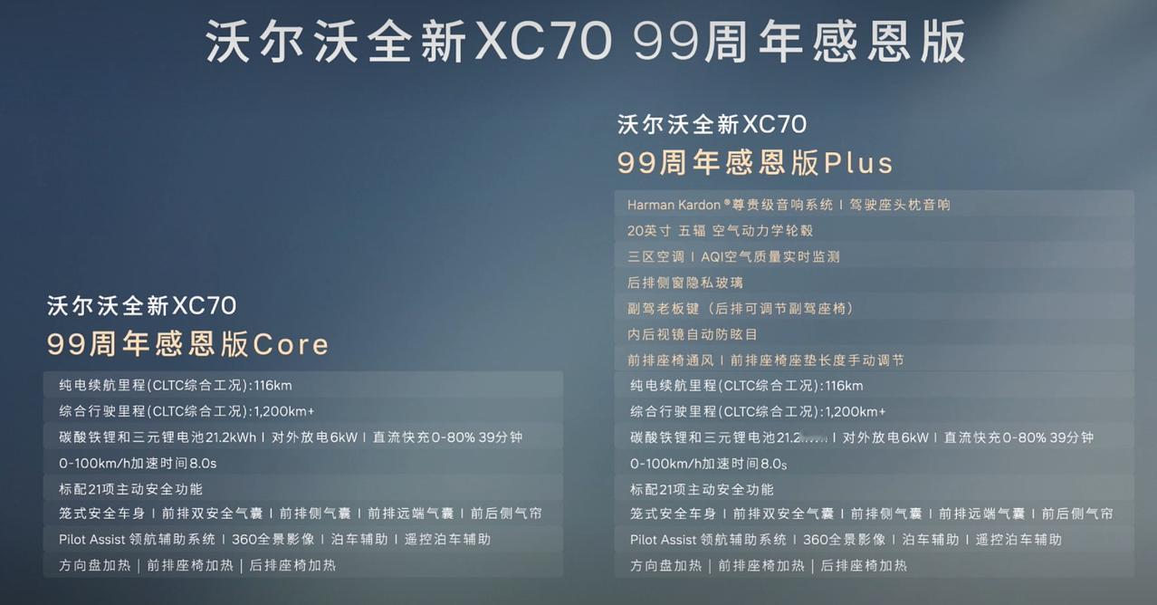 24.99-26.99万的沃尔沃XC70性价比很高啊 2个配置(插混型): 24.99万 99周年感恩Core 116km/21.2kWh电池/零百8s/Pilot Assist领航辅助驾驶(L2) 360全景影像/泊车辅助/遥控泊车/外放电6kW 前后座椅加热/方向盘加热 26.99万 99周年感恩版Plus 20寸空气动力学轮毂/哈曼卡顿音响+头枕音响 三区空调+AQI空气检测 前排座椅坐垫+前排通风/后排私隐玻璃/后视镜防眩目/副驾老板键/后排私隐玻璃 不到30万买沃尔沃豪华车,这还要啥自行车啊。100多公里的续航日常代步也够用,主要跑油的话,插混还能省一些,空间也够,内饰无异味,安全性也足够,总体还OK?【来自懂车帝车友圈】