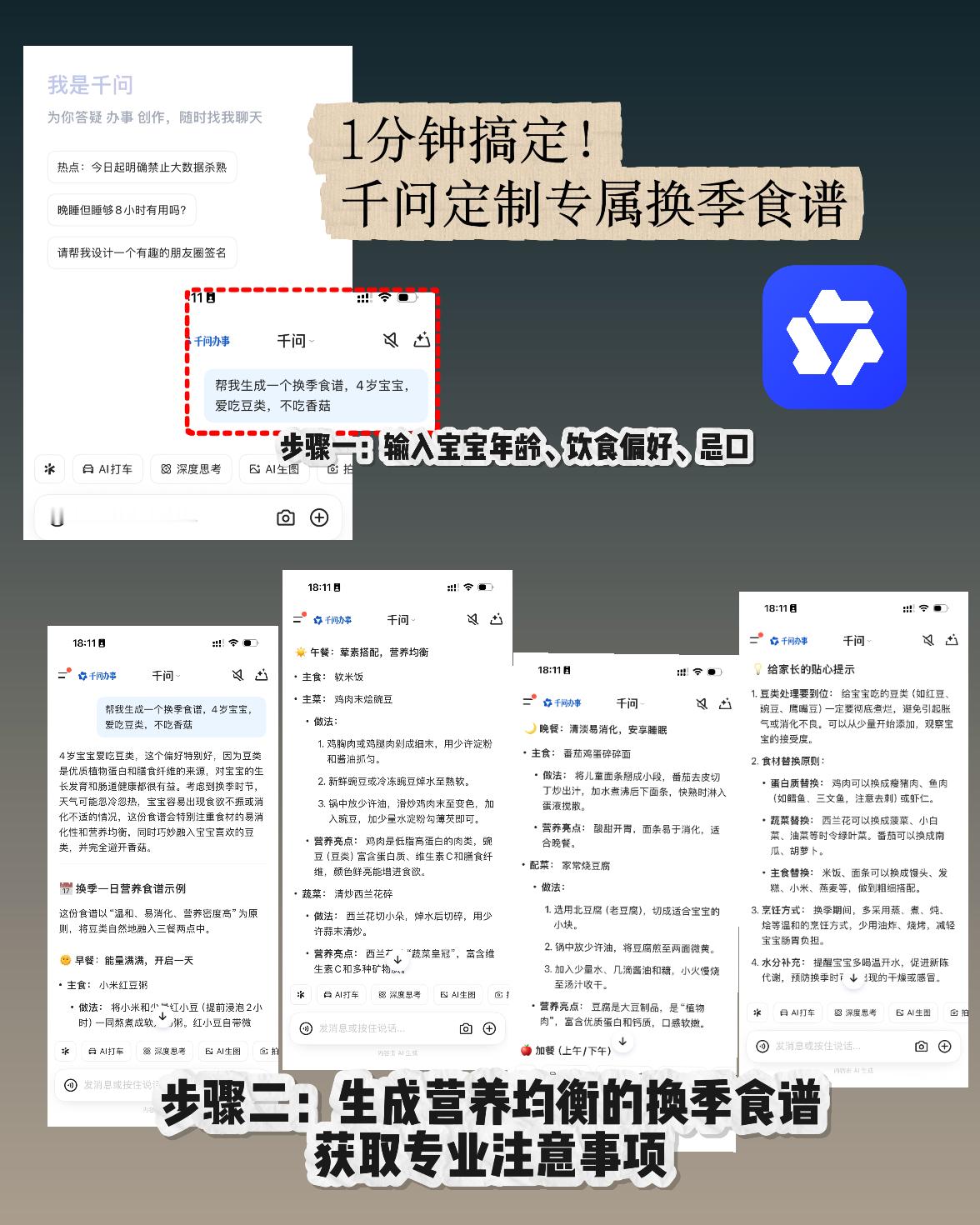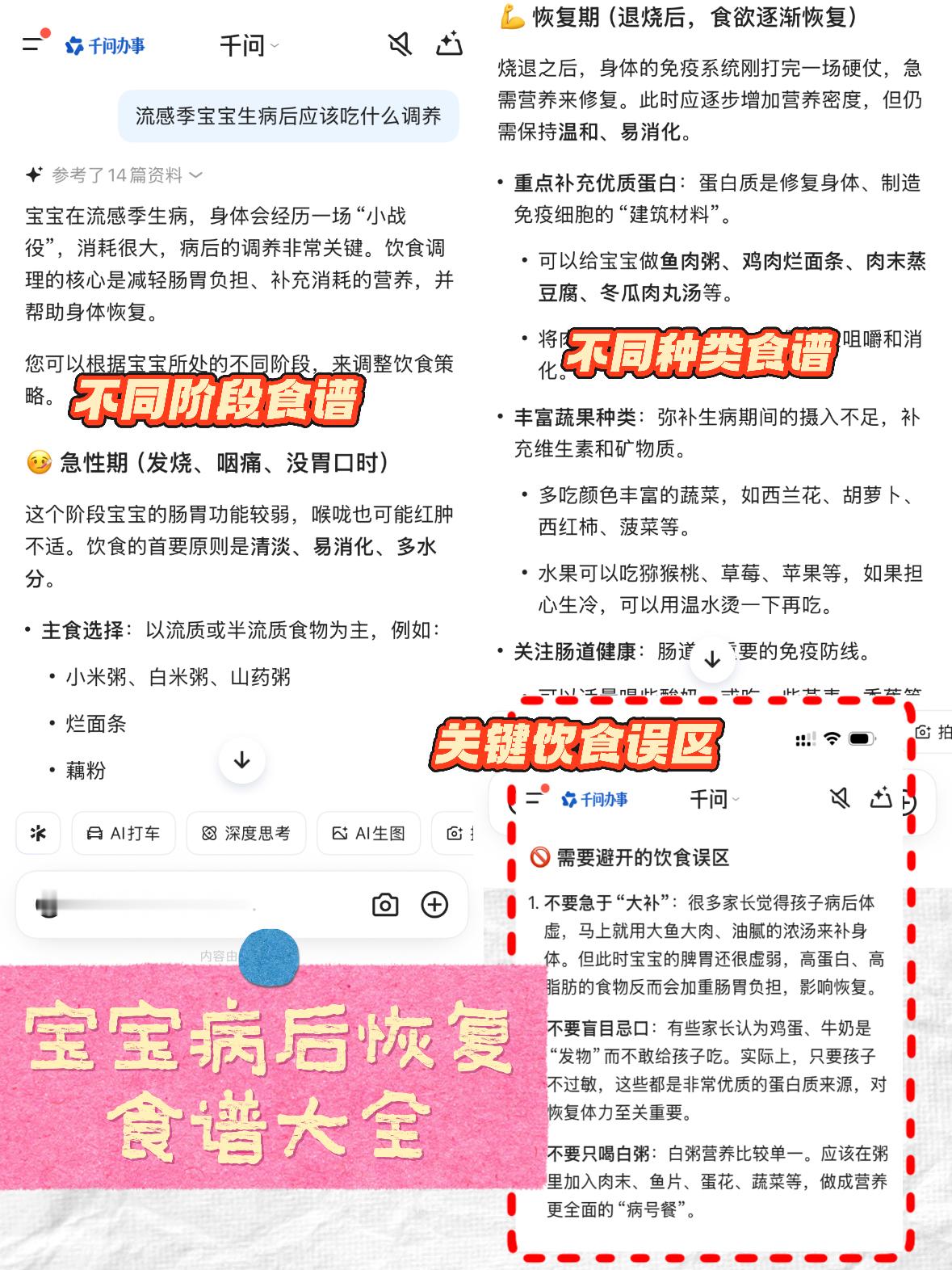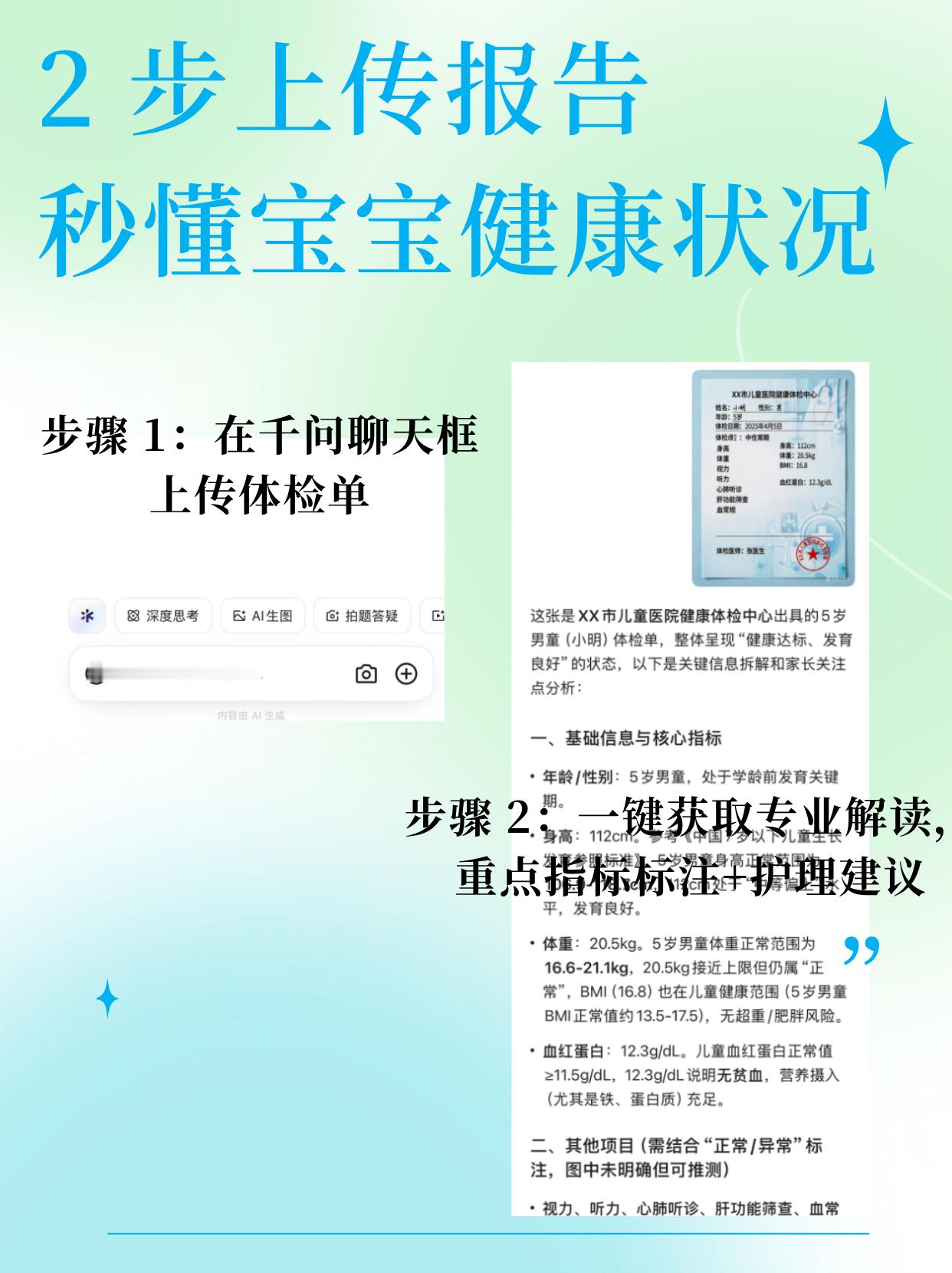 我们的爸妈vs我们当爸妈 千问把健康整得明明白白 以前拿到化验单只能干着急,现在我们当爸妈,有AI帮忙解读~春季传染病高发期,各类病毒无孔不入,孩子好不容易痊愈了,又病怏怏什么都不肯吃,再复诊医生也说没什么大问题,但家长看着就是焦心。这时候别自己瞎百度了!直接将症状上传到千问健康——它会解释每个症状异常的可能原因,还给提供医疗辅助和生活建议。就算换季了,不知道给宝宝吃什么,他也能AI一键生成。千问AI真的能告诉你在换季期间如何更好照顾孩子。日常健康问题也能查,覆盖全家老小!养娃少一点焦虑,多一点靠谱AI辅助💪千问千问健康