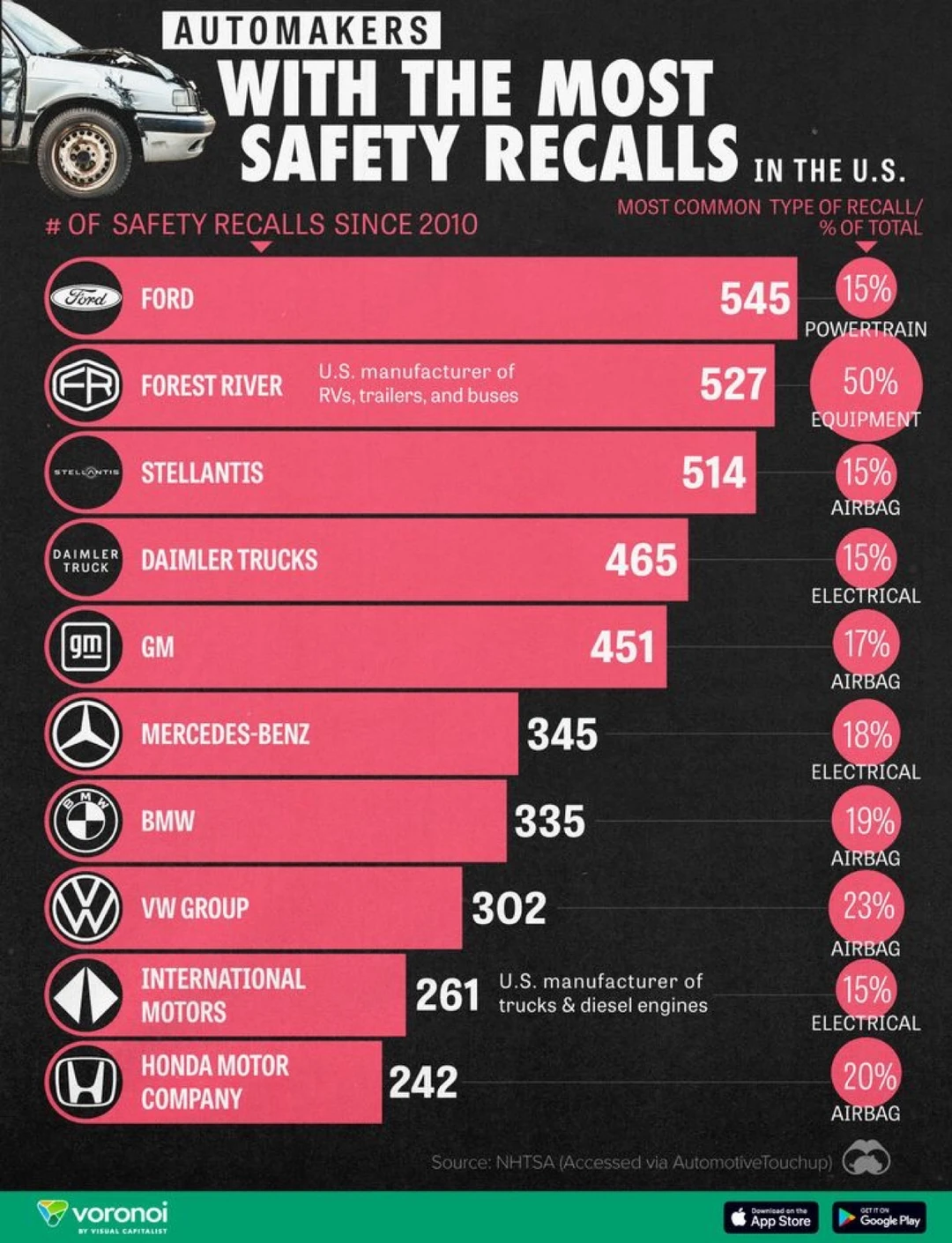 这张图统计的是自2010年以来,美国市场汽车品牌的安全召回次数排名,以及各品牌最常见的召回原因类型。
