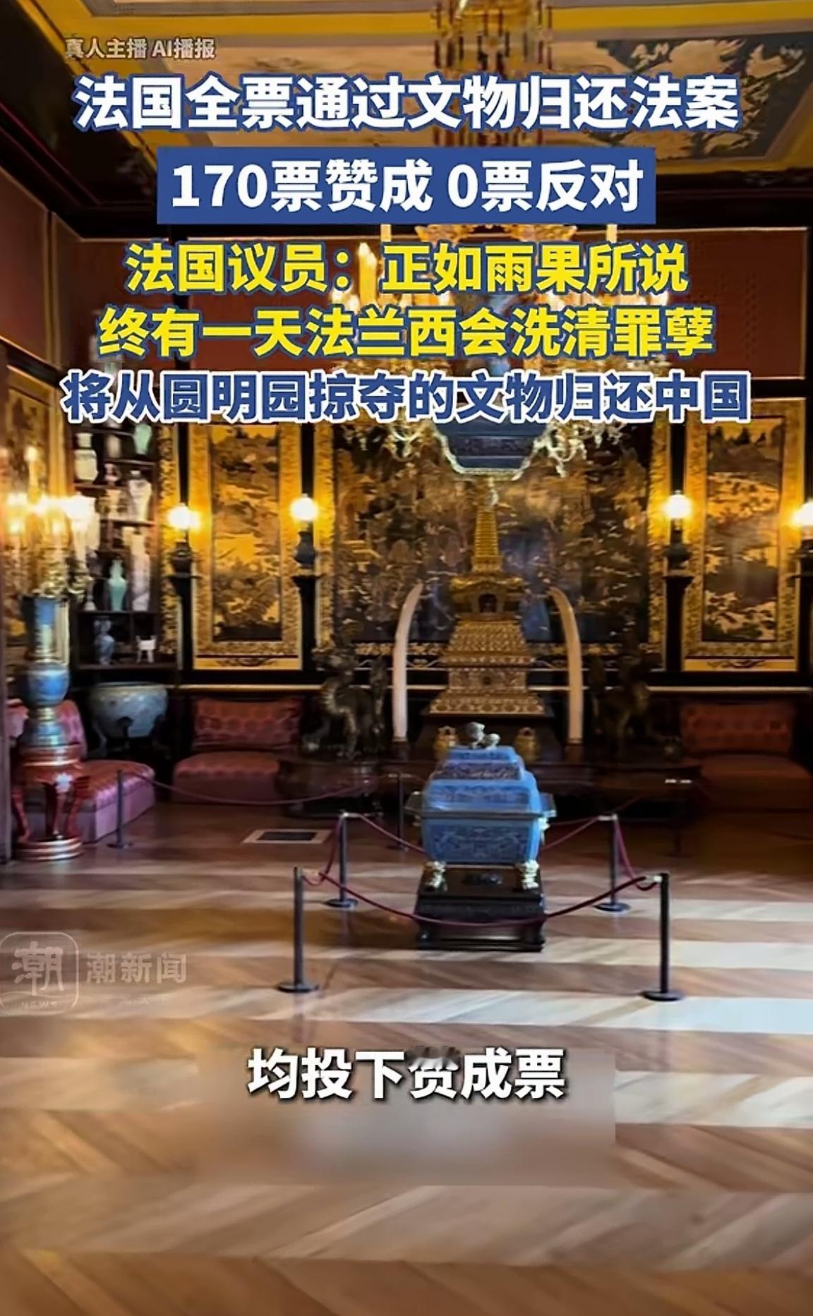 那些满清统治者与国外势力强加在我们身上的耻辱,正在被站在历史潮头努力奋斗的华夏民族一一洗刷。 我们欢迎法兰西这次做出归还历史掠夺文物的决定,这无疑是一个正确的选择。 同时法兰西的这一行为,也为当年有着同样罪行的国家提了一个醒,只有付诸行动才能洗清历史罪孽。