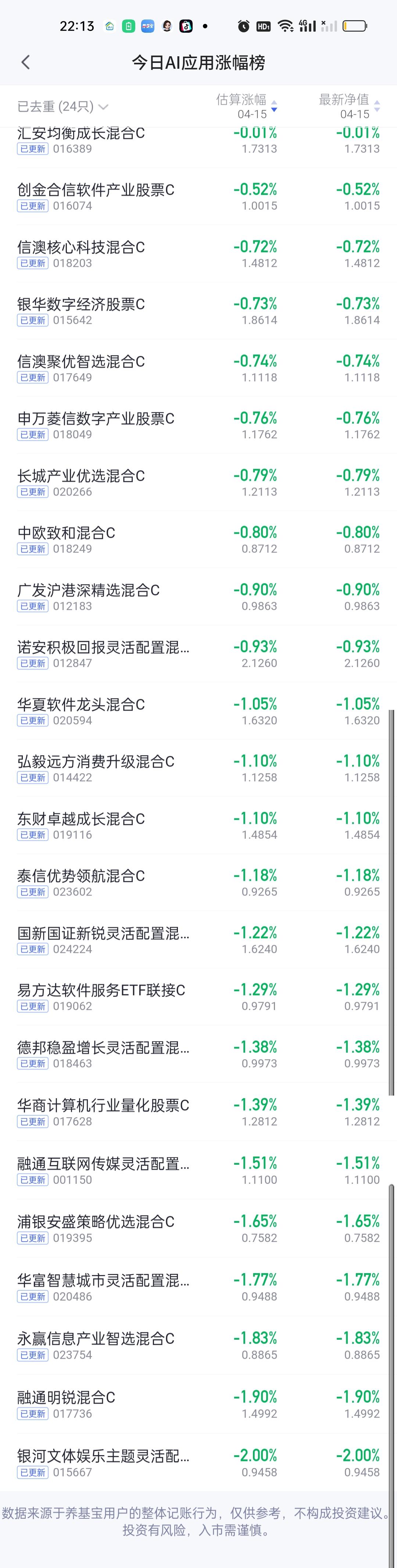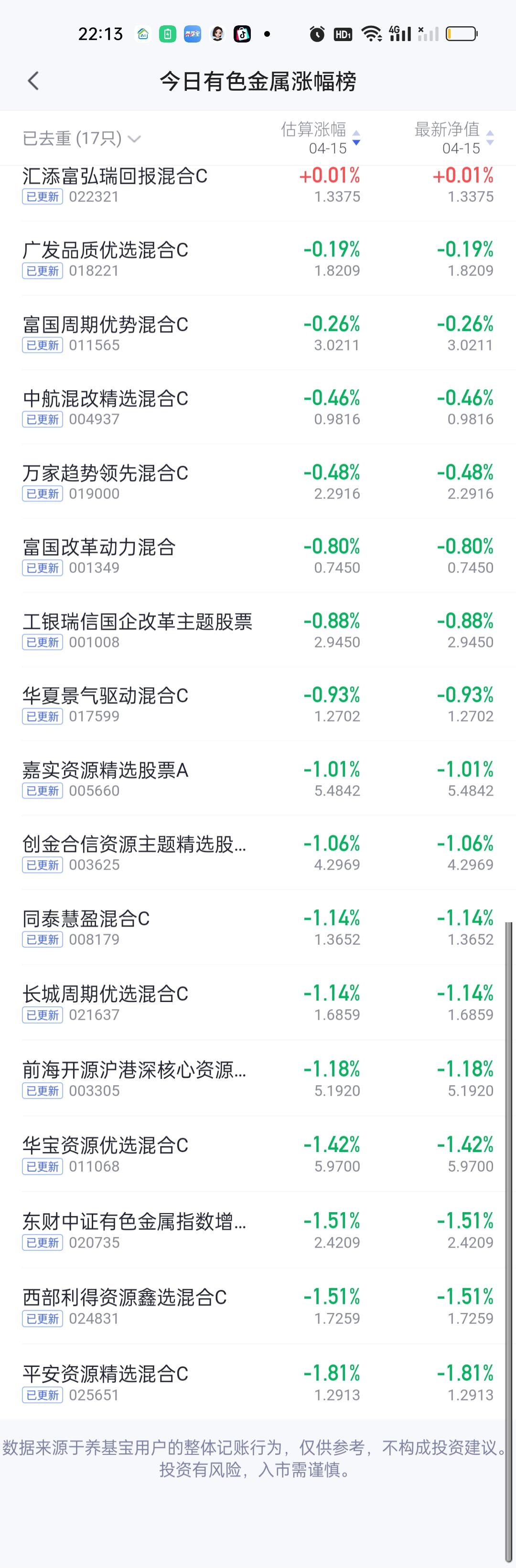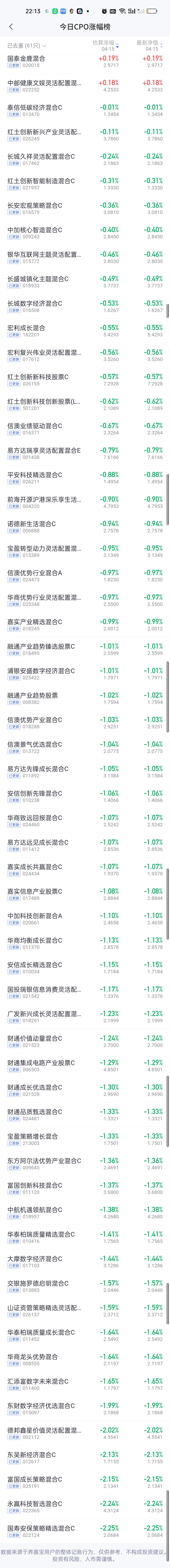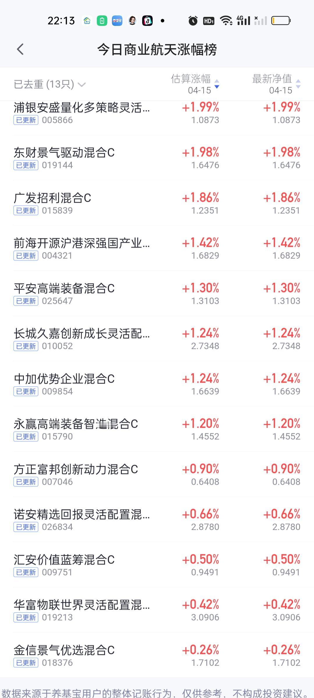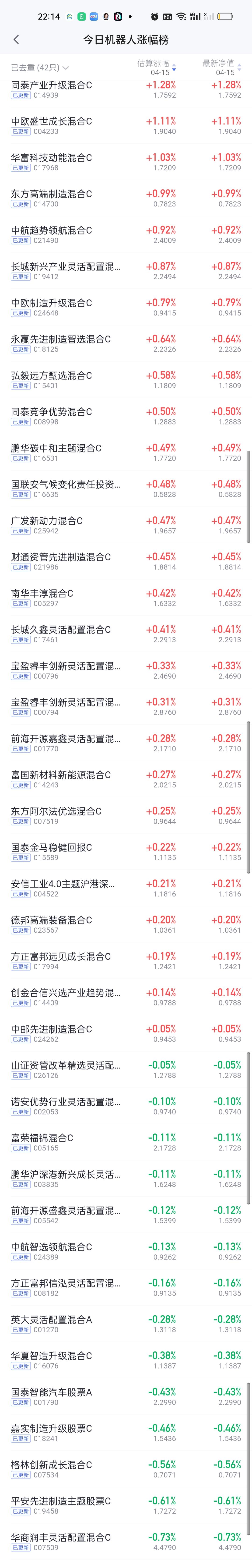 今日基金净值榜已全部更新完毕。排名靠前的除了国投白银其它都是来自创新药板块的基金。 中银港股通医药涨6.03%排名第一,中航恒宇港股通价值5.89%排名第二,国投白银5.31%排名第三,中银创新医疗5.29%排名第四,东吴医疗服务5.25%排名第五,东吴创新医疗和华泰柏瑞港股通医疗5.04%排名第六。这也是今天收益率在5%以上的全部七只基金。 跌幅榜方面,东方汽车产业趋势跌3.74%排名第一,国寿安保低碳经济3.59%排名第二,华宝绿色领先股票3.57%排名第三,富国资源精选3.53%排名第四,华夏核心成长3.52%排名第五,前海开源周期精选3.51%排名第六。 有色金属,商业航天,AI应用,CPO,机器人,创新药涨幅榜一并奉上!