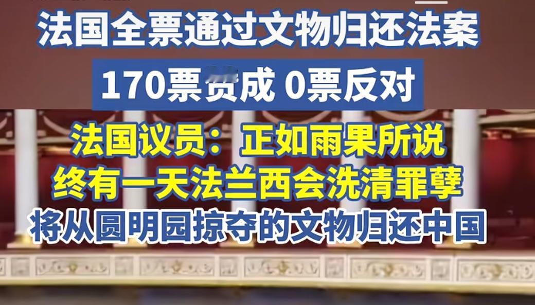 4 月 13 日,法国议会以 170 票赞成、0 票反对的结果,通过了一项决议,决定将 1852 年至 1972 年期间殖民掠夺的中国文物归还给中国。附带条件是,归还国须按照国际文物保管标准进行保管,并向民众开放展览。