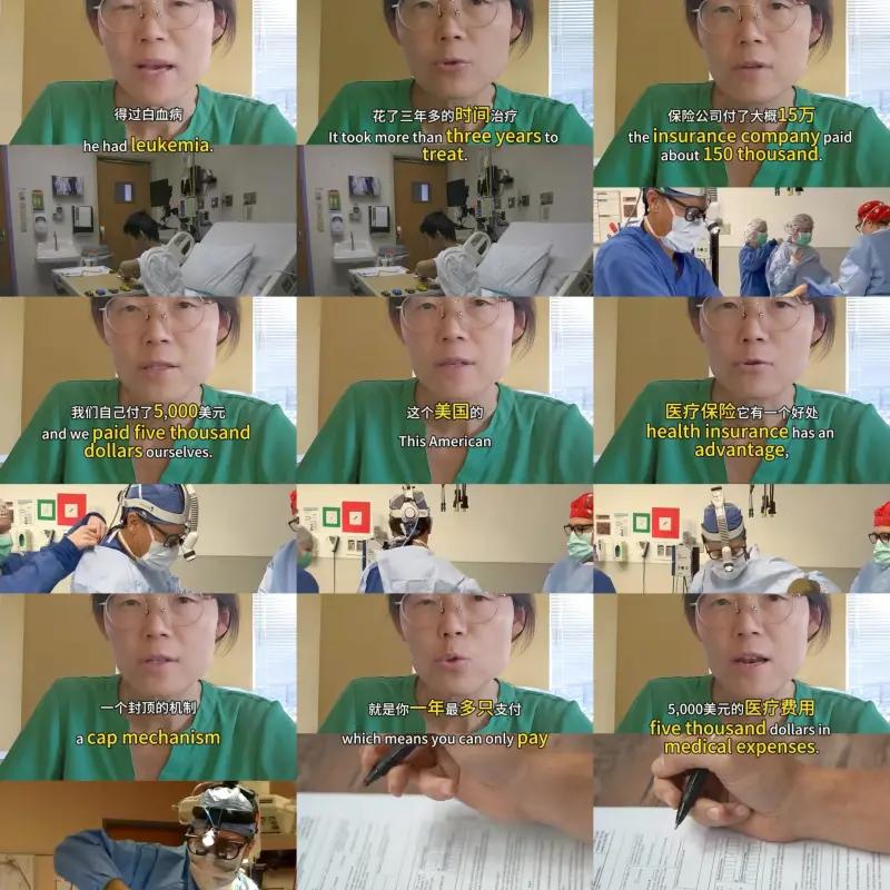 这段画面呈现了一位华裔医疗从业者结合自身经历,讲解美国医疗保险年度自付封顶机制的内容。她曾罹患白血病,历经三年多治疗,此次医疗总花费约 15.5 万美元,其中保险公司赔付约 15 万美元,个人仅自付 5000 美元。她借此案例重点说明,美国医保设有 “封顶机制”,即个人一年的医疗自付费用有明确上限,无论当年总医疗费数额多高,只要自付金额达到该上限(此案例中为 5000 美元),超出部分便由保险公司全额承担,这一机制能有效避免家庭因重病遭遇巨额医疗支出。画面中还穿插了病房、手术室等医疗场景画面,搭配中英双语字幕,直观清晰地传递了核心信息。