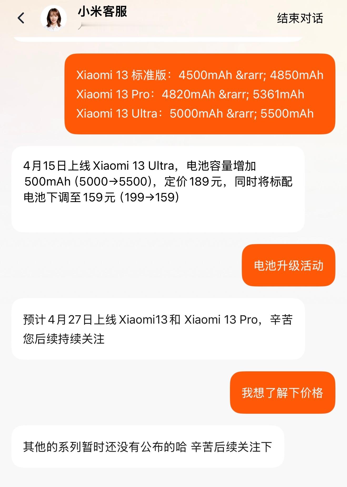 Xiaomi 13 标准版:原4500mAh升级后4850mAhXiaomi 13 Pro:原4820mAh升级后5361mAhXiaomi 13 Ultra:原5000mAh升级后5500mAh