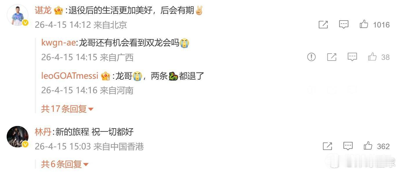 此外,奥运冠军谌龙写道:退役的生活更加美好,后会有期