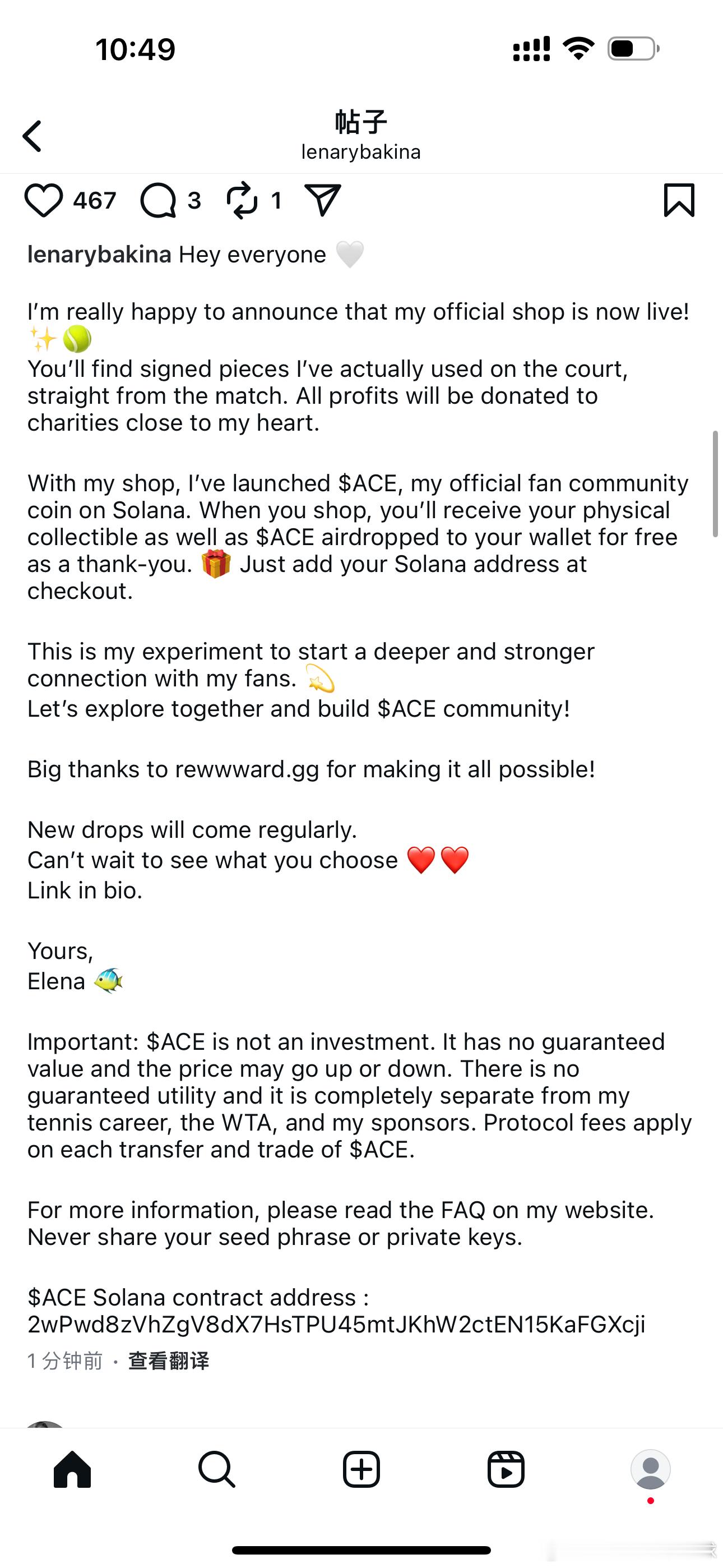 娜娜刚刚更新了ig,宣布自己的官方商店上线;主要是售卖她本人的比赛用品,所有收益都捐献给她的慈善机构