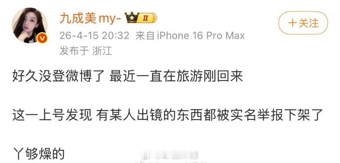哦豁,九成美又出来发微博了,这刚去旅游完回来,感觉戾气还挺重的啊,说好多视频被实名举报下架了