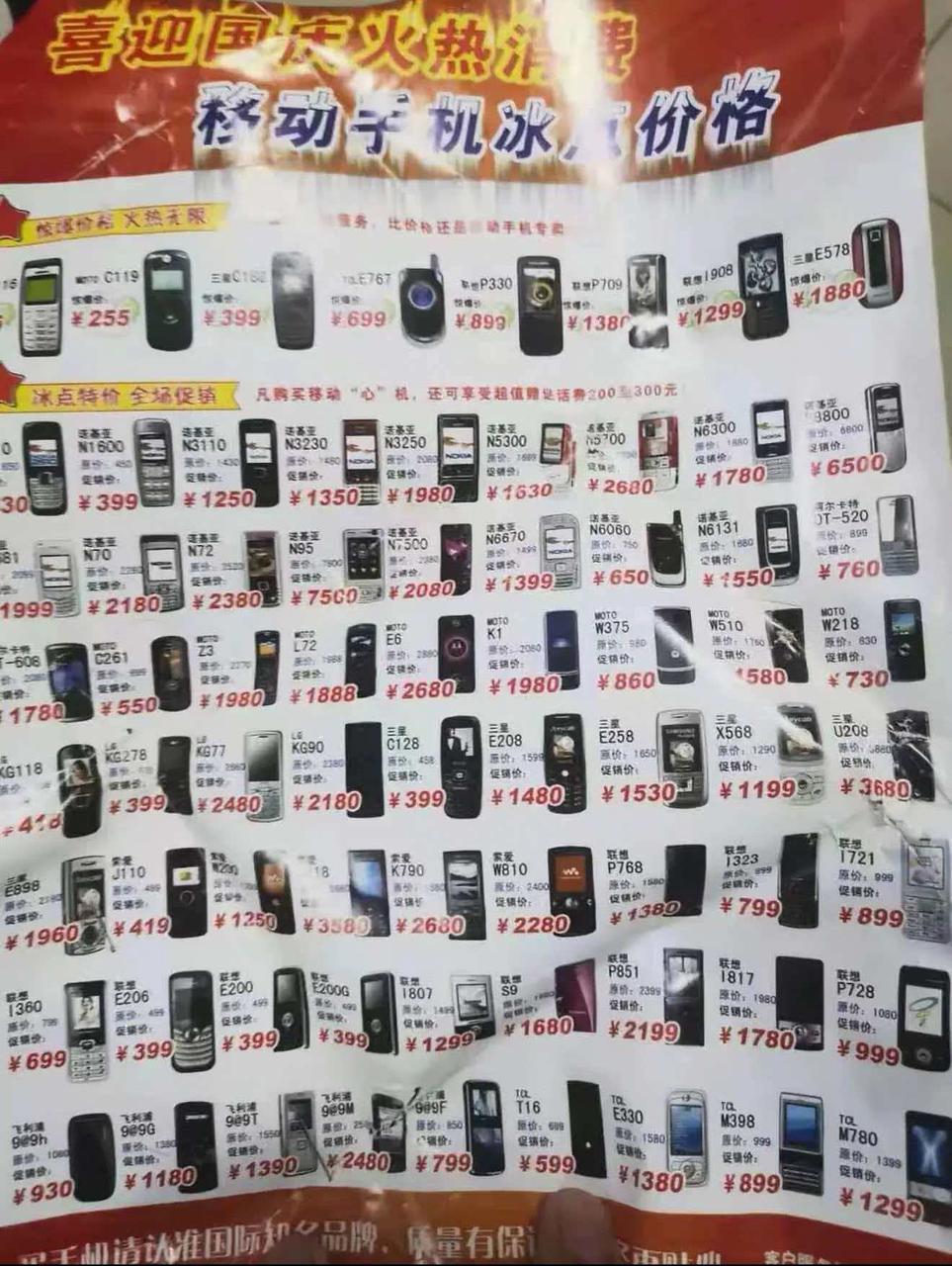 以防你不知道手机发展得有多快 带你看一张十几年前的手机宣传海报,那时候网络还没现在这么发达,卖手机、做宣传更多靠线下海报,别看是老手机,价格一点都不便宜,像诺基亚有些机型当年就卖到六七千,放在当时的收入水平下,比现在买旗舰机更有冲击力,现在再回头看,真的满满都是时代回忆