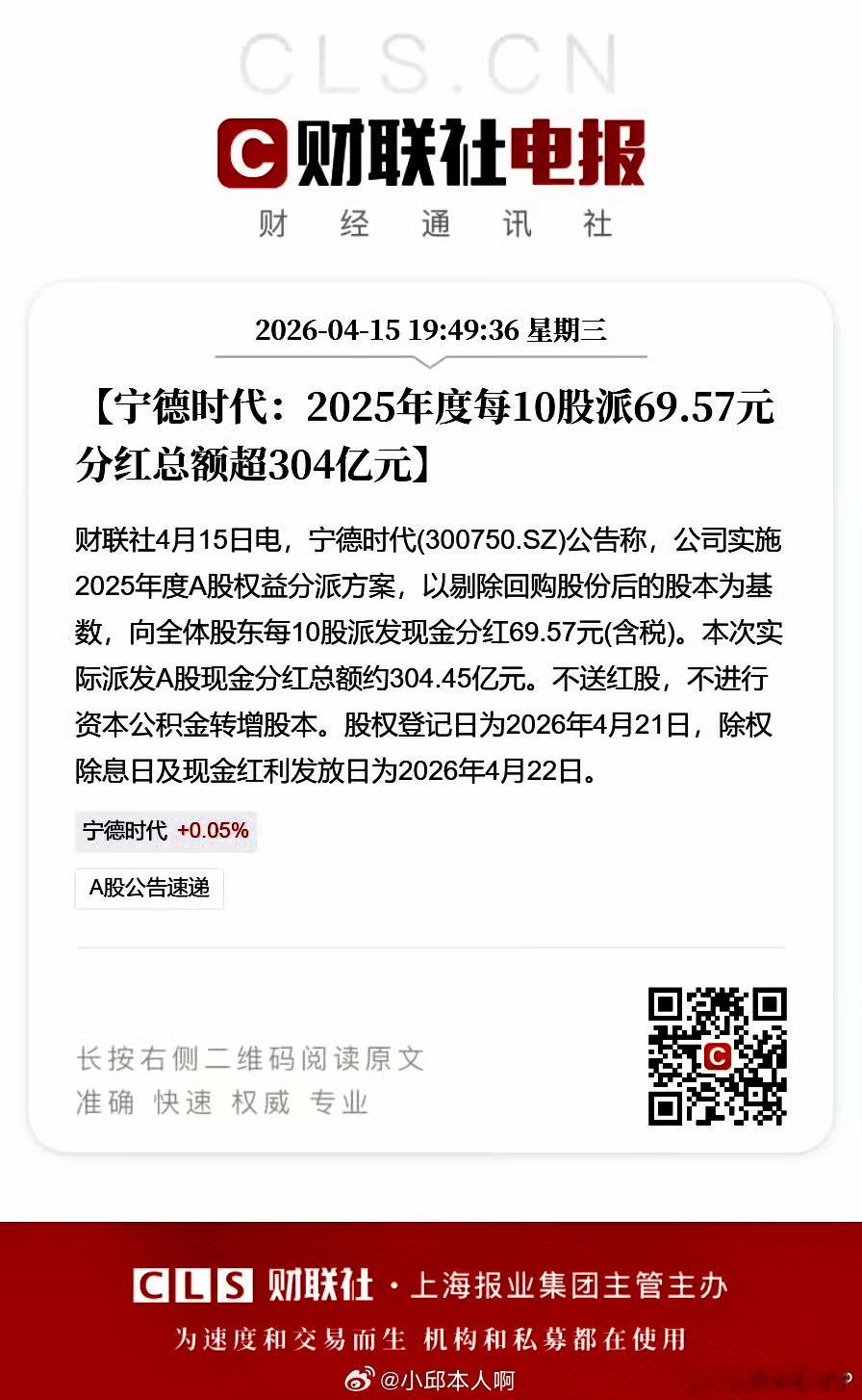 宁德时代分红304亿宁德时代赚麻了,没每10股派69.57元。