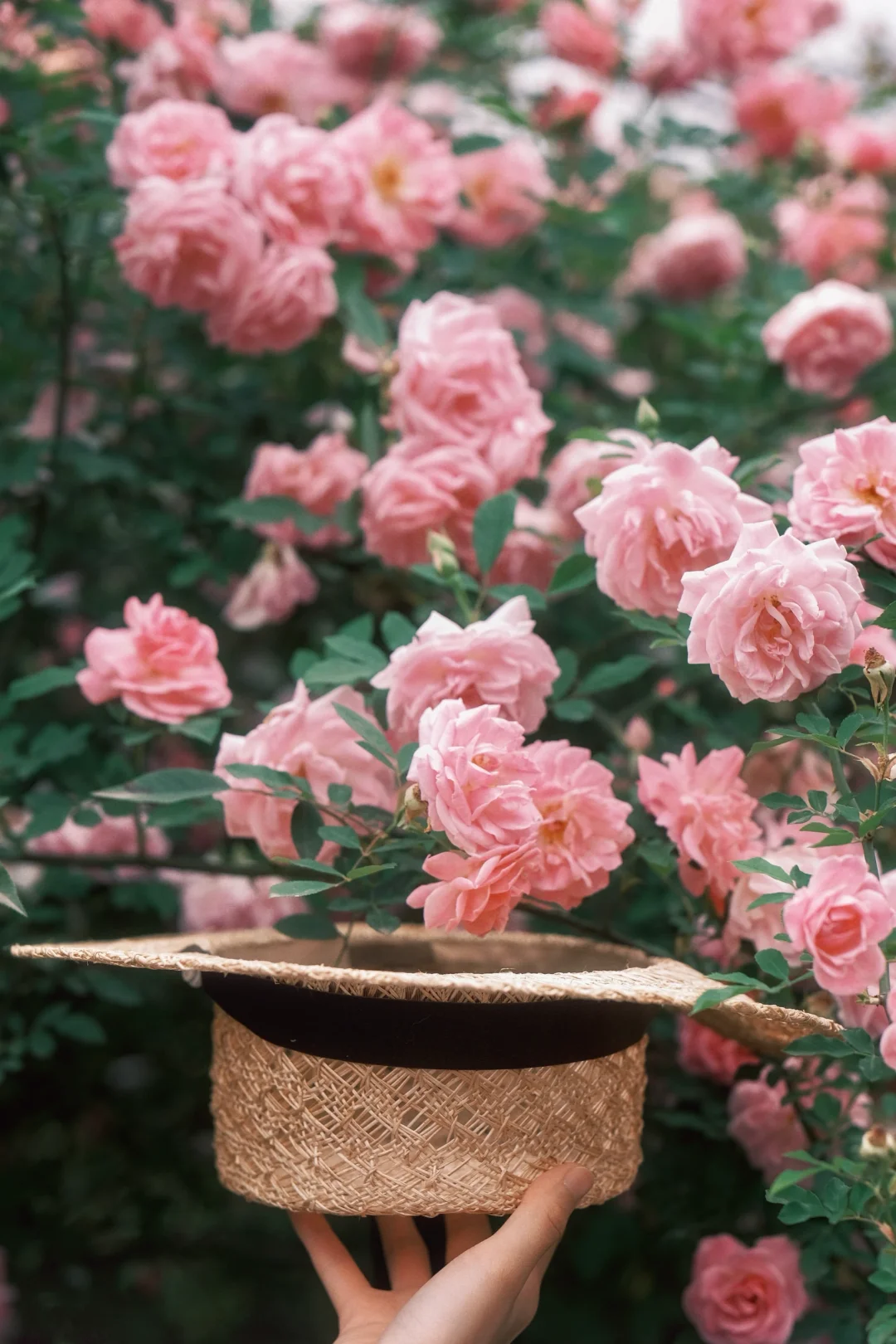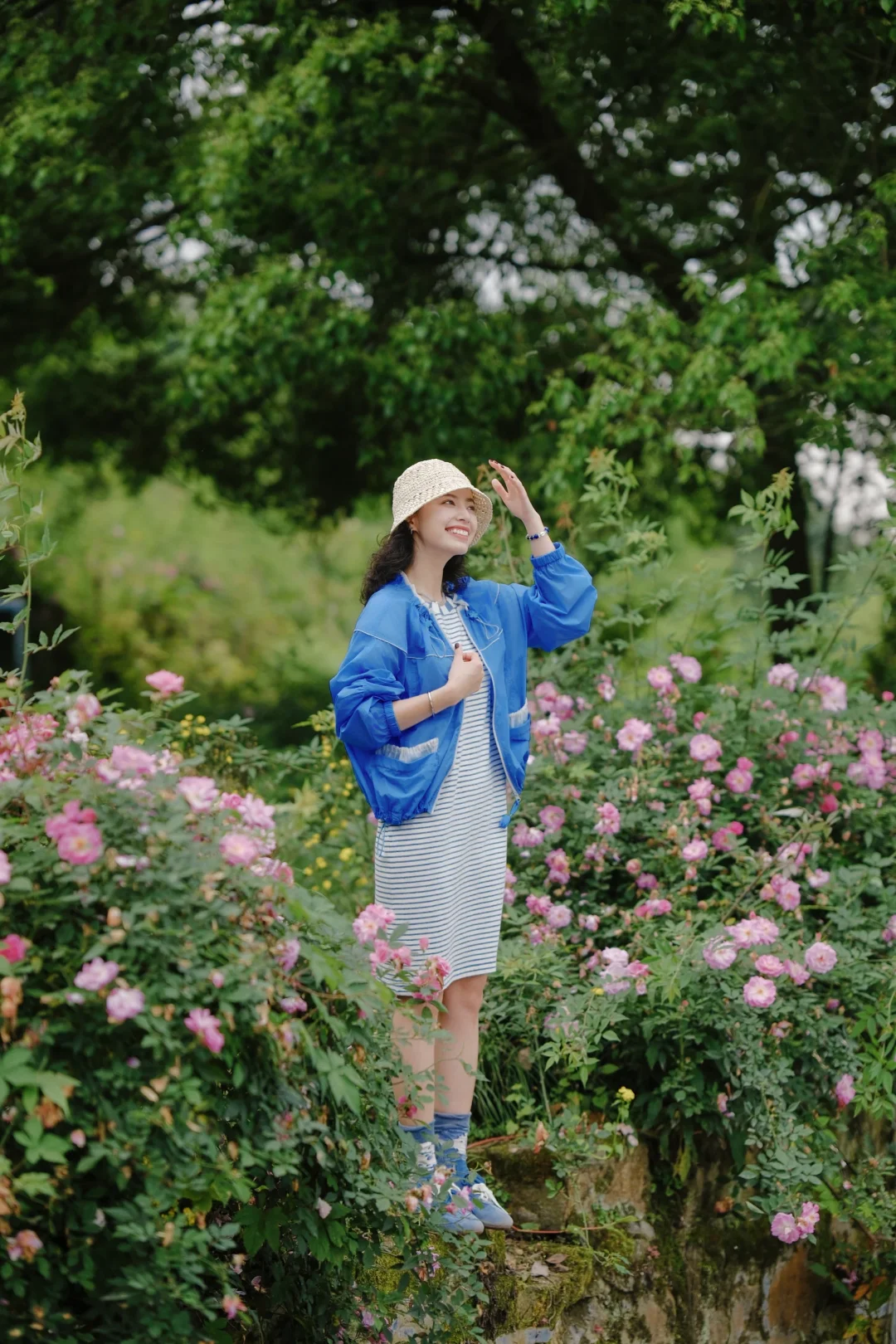 🔺找到一丛花量饱满的位置,将帽子置于花墙下方俯拍。