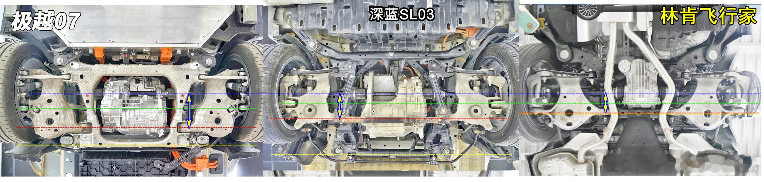 蓝线表示半轴位置,用来对齐三张图。绿线是H臂外后硬点位置,大家差异不大。红线是H臂内后硬点位置,电车普遍比油车靠后,极氪别深蓝更靠后。。。黄线是副车架‘后墙’位置,电机或差速器基本上不能超过这个。