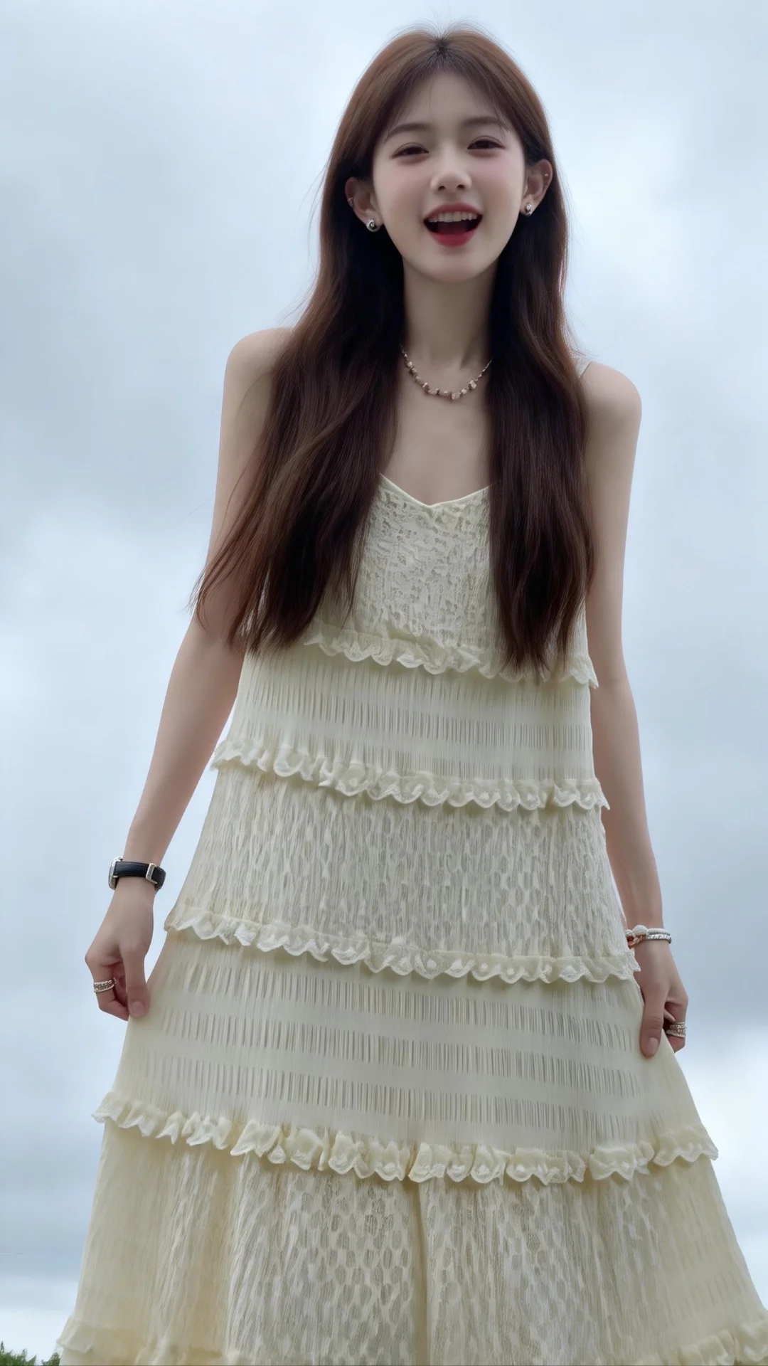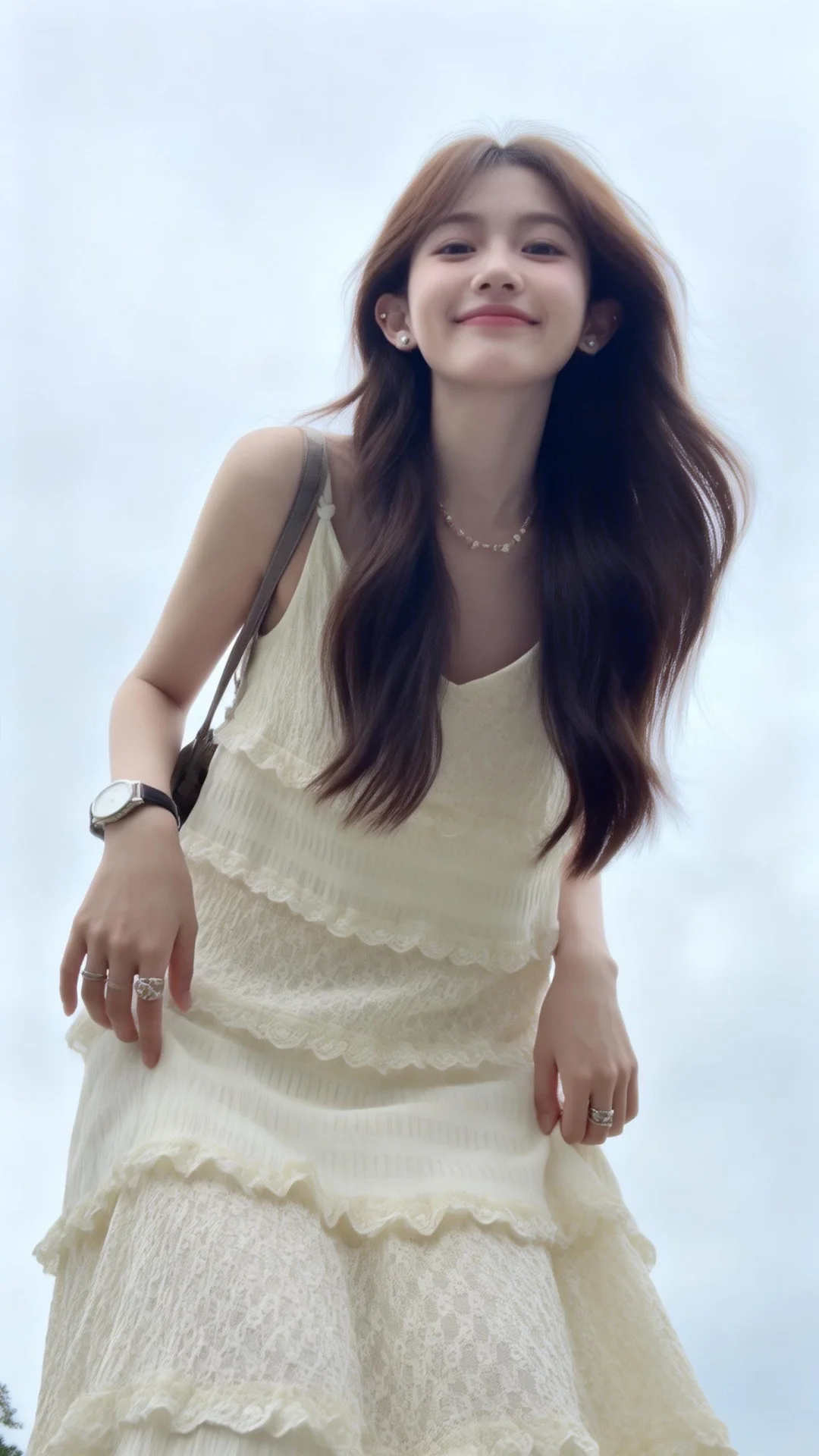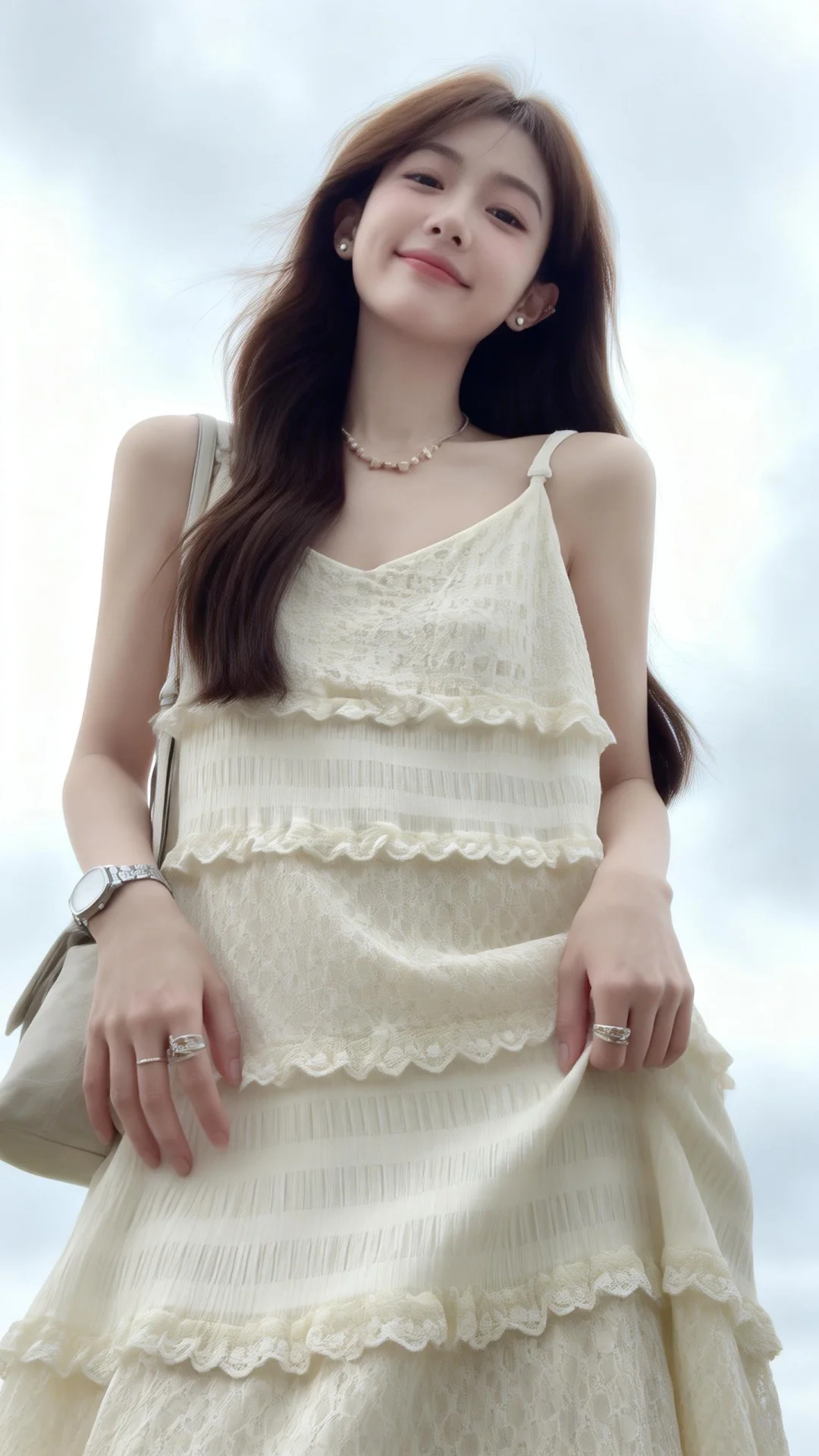 图片为梦幻朦胧感,环境为阴天,柔和的光线笼罩。室外,一位棕色长发及腰、模样可爱的冷白皮女生,表情可爱,身着法式复古奶油千层蛋糕裙,米白色,V领细吊带,多层荷叶边蛋糕裙摆,蕾丝拼接,压褶肌理感,宽松A字大摆,及地长款,其软糯的质感和清晰的层次十分突出。随机首饰,身材完美,背着包包,戴耳钉,戴手表,戴戒指,戴项链,莫兰迪配色,高颜值,打光不均匀造成的轻微曝光过度,做可爱表情,眉清目秀,初恋感,表情自然松弛慵懒休闲,眼神很自然不失真,完美身材,皮肤质感白嫩清透,甜美女生,完美贴合身形;整体风格简约大气,又因修身剪裁,俏皮灵动,嫩白皙柔滑,氛围感,故事感,视觉冲击效果,高级感,动态感,32K,大师杰作,,三庭五眼,瓜子脸,清纯,展现冰瓷玉肌冷白皮绝世美人,中景照,少女感网拍,冷白皮超美女孩,清透裸妆,户外场景,仰拍镜头,正脸看镜头,蓝天白云,纯欲感,白嫩嫩的皮肤,如琼玉般润滑,软萌气质。慵懒外套白内衬。戴项链,精致耳钉,钻石手链。日常快照风格,非精心构图打光,生活感强,无修饰感。