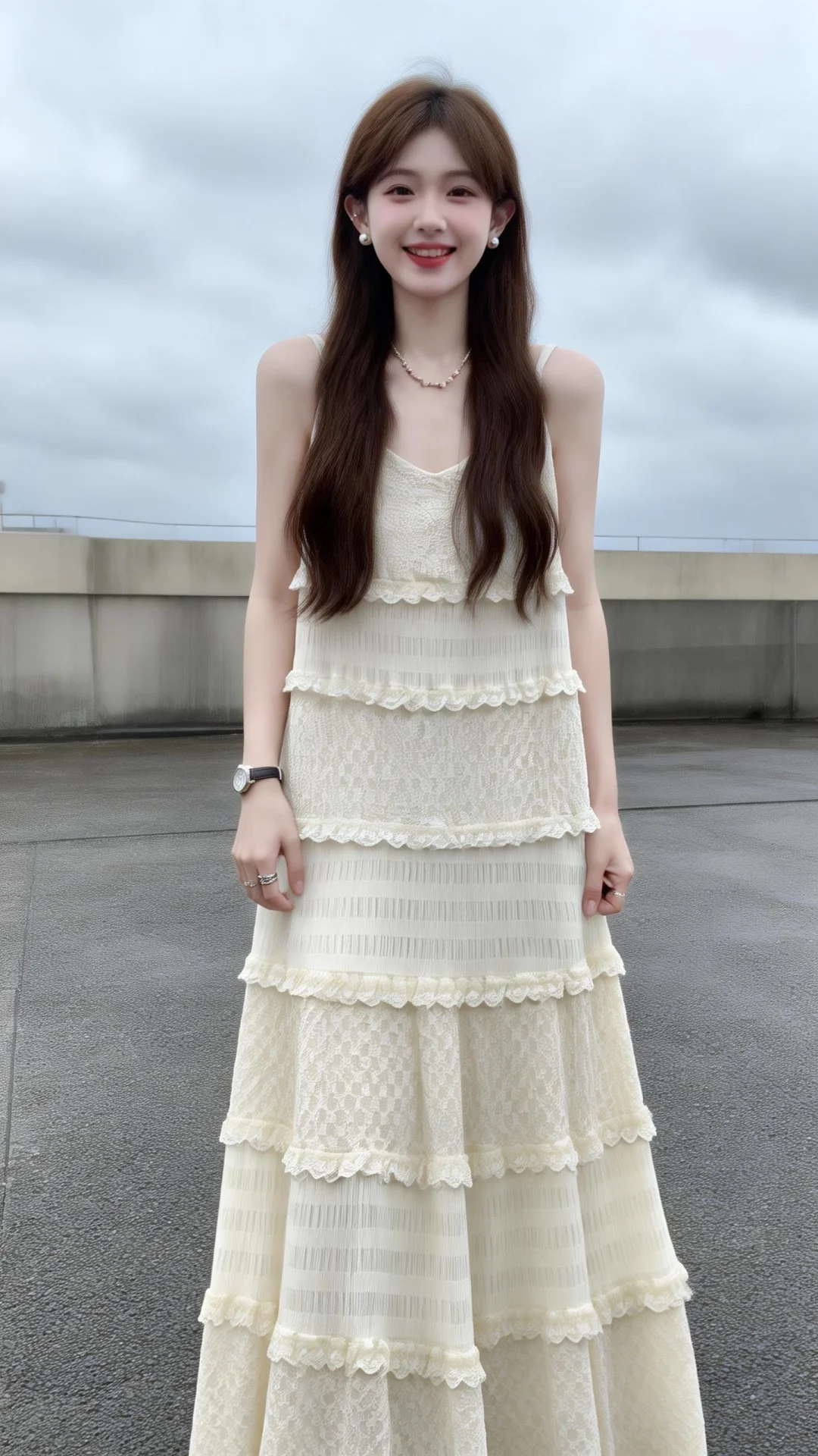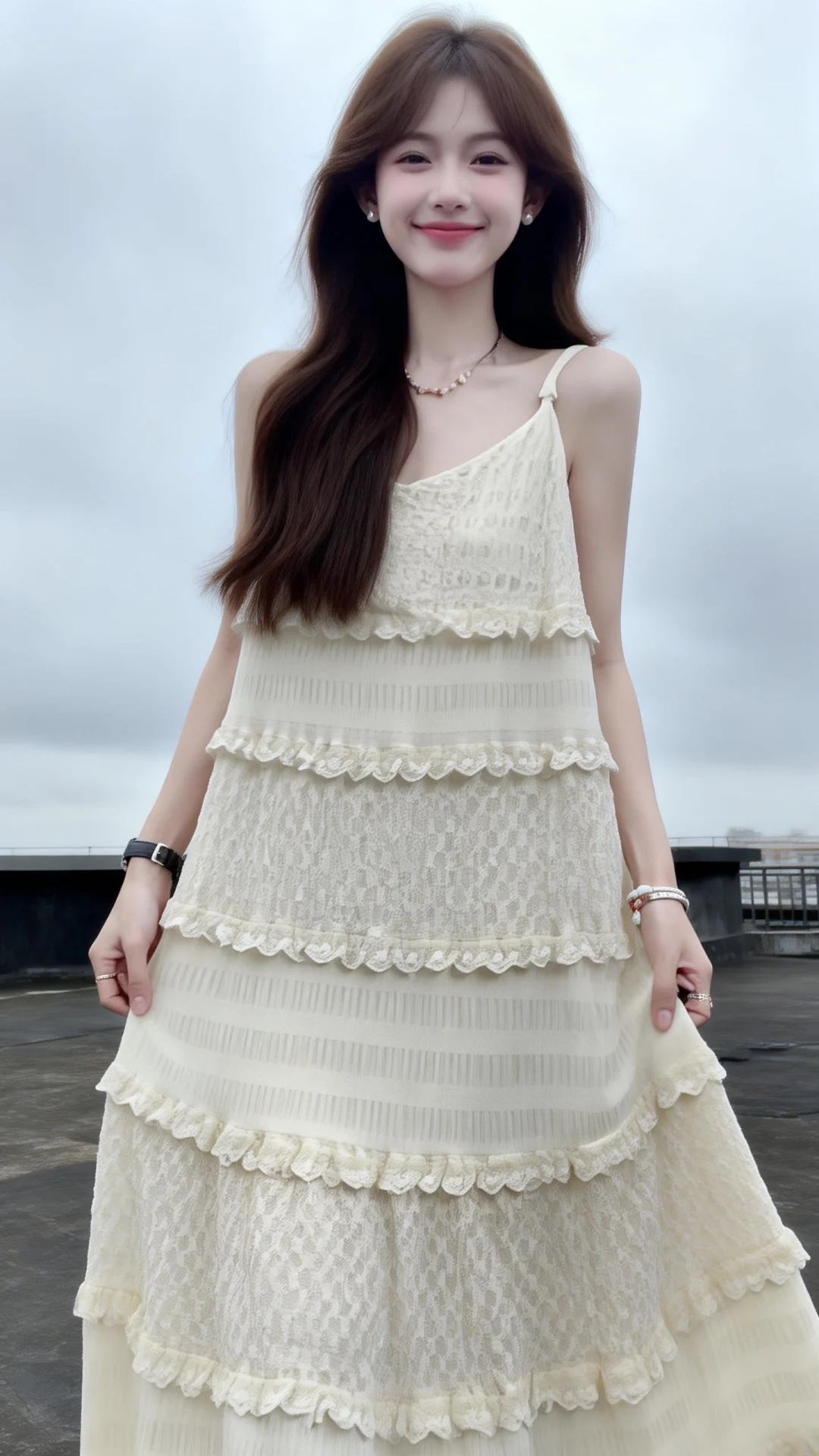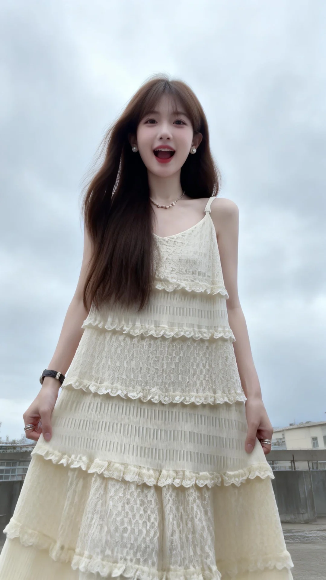 图片为梦幻朦胧感,环境为阴天,柔和的光线笼罩。室外,一位棕色长发及腰、模样可爱的冷白皮女生,表情可爱,身着法式复古奶油千层蛋糕裙,米白色,V领细吊带,多层荷叶边蛋糕裙摆,蕾丝拼接,压褶肌理感,宽松A字大摆,及地长款,其软糯的质感和清晰的层次十分突出。随机首饰,身材完美,背着包包,戴耳钉,戴手表,戴戒指,戴项链,莫兰迪配色,高颜值,打光不均匀造成的轻微曝光过度,做可爱表情,眉清目秀,初恋感,表情自然松弛慵懒休闲,眼神很自然不失真,完美身材,皮肤质感白嫩清透,甜美女生,完美贴合身形;整体风格简约大气,又因修身剪裁,俏皮灵动,嫩白皙柔滑,氛围感,故事感,视觉冲击效果,高级感,动态感,32K,大师杰作,,三庭五眼,瓜子脸,清纯,展现冰瓷玉肌冷白皮绝世美人,中景照,少女感网拍,冷白皮超美女孩,清透裸妆,户外场景,仰拍镜头,正脸看镜头,蓝天白云,纯欲感,白嫩嫩的皮肤,如琼玉般润滑,软萌气质。慵懒外套白内衬。戴项链,精致耳钉,钻石手链。日常快照风格,非精心构图打光,生活感强,无修饰感。