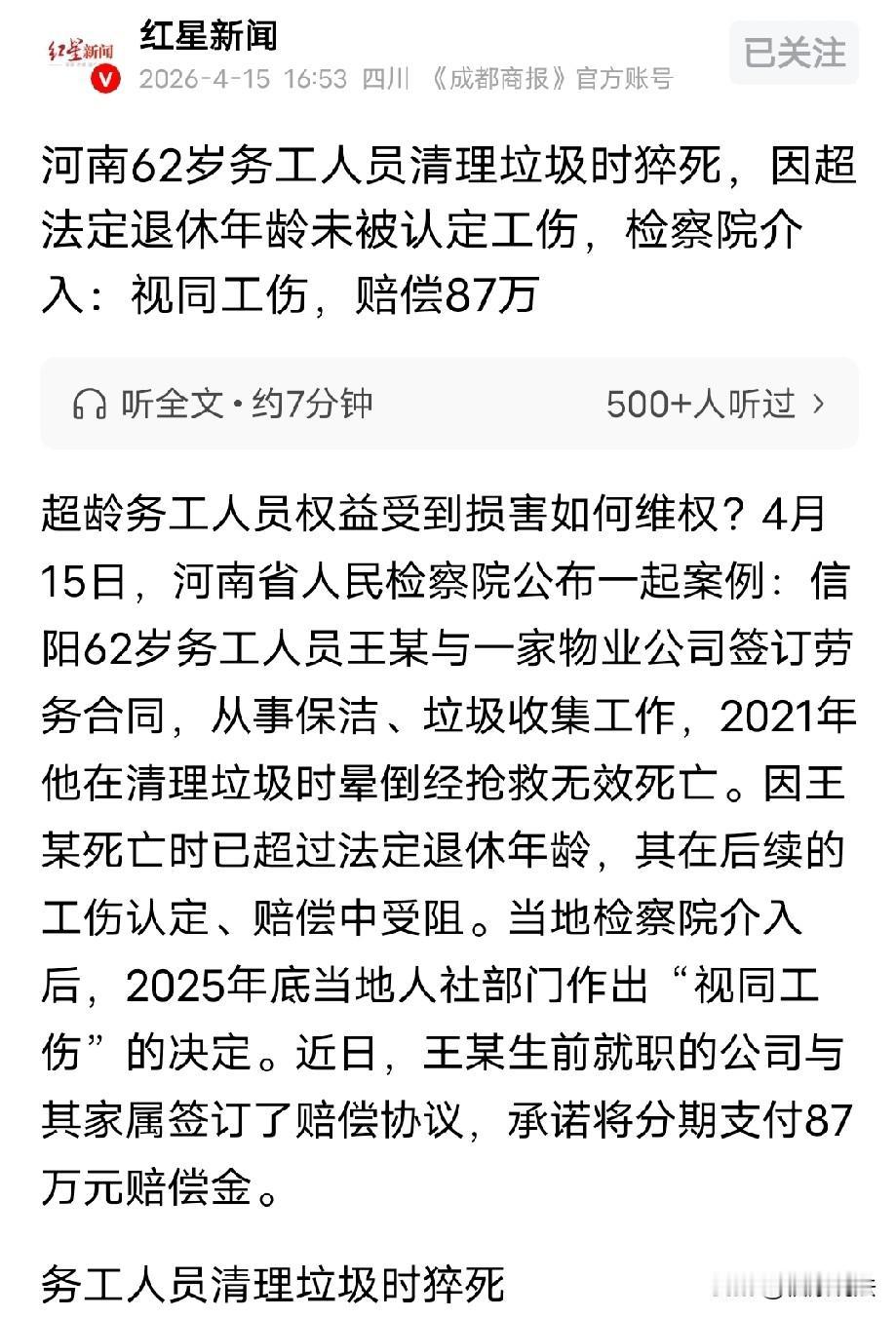 河南信阳,62岁男子是一名农民,为了养家糊口,找了一份保洁工作,清理垃圾时突然猝死,家属找物业公司索赔遭拒,无奈去申请工伤认定,结果,人社局认为男子62岁已经超过退休年龄,不能认定工伤。家属又告上法院,却被驳回,家属奔波2年后,只好去找检察院求助,这次终于迎来了曙光。 王某是一名农民,62岁的他本该是在家安享晚年的年纪,却因为家里日子紧巴,不得不背起行囊进城打工,靠着体力挣点辛苦钱。 他没什么一技之长,只能找了份保洁的活儿,2020年年底和一家物业公司签了劳务合同,每天守着垃圾站,负责清理垃圾、打扫卫生,一干就是一年多。 这份工作又脏又累,风吹日晒,王某从没抱怨过,每天按时到岗,老老实实干活。 他只想趁着能干动好好干活,按月拿工资,帮家里减轻点负担,可谁也没想到,意外来得毫无征兆。 2021年11月的一天傍晚,王某在垃圾站清理垃圾,正忙着干活呢,突然眼前一黑,晕倒在垃圾清运车旁。 工友发现后赶紧报警,急救车火速把他送往医院,当天晚上,王某因心肌梗死猝死,永远离开了人世。 王某的家人悲痛欲绝,好好的人在干活时说没就没了,料理完后事,家属想着王某是在工作时出事的,公司总得给个说法。 可找到物业公司后,对方的态度却让人寒心。 公司表示,他们和王某签的是劳务合同,不是劳动合同,而且之前已经垫付了部分抢救费,该做的都做了,压根不愿承担赔偿责任。 无奈之下,家属只能走法律途径,2022年2月,向人社局申请工亡认定。 可结果再次给了他们沉重一击,人社局以王某已经62岁,超过了法定退休年龄为由,直接不予受理工伤认定申请。 家属不服气,一纸诉状把人社局和物业公司告上法院,可法院审理后,也以超龄、双方是劳务关系为由,驳回了他们的诉求。 2023年2月,家属又申请再审,可迟迟等不到结果。 整整两年时间,家属四处奔波,一次次碰壁,满心都是委屈和绝望。 王某是在上班时间、干活的地方,突然出事没了命,说白了就是累倒在工作岗位上,就因为他过了60岁的退休年纪,签的是劳务合同不是劳动合同,公司就不想担责,也不认定工伤,家属怎么都咽不下这口气。 王某的妻子更是整日以泪洗面,老伴辛苦打工却落得这般下场,维权之路看不到一点希望。只能抱着最后一丝希望,走进了检察院的大门求助。 此事中,王某62岁,法律方面没说“超龄就不算劳动者”,他是农民工、没退休金、没养老保障,还靠干活养家。 他签的虽是劳务合同,但实际被物业公司管理、考勤、发固定工资、长期稳定干活,本质是劳动关系 。 另外,他在上班时间、上班地点、干工作时突然心梗猝死,完全符合“视同工伤”的条件。 《工伤保险条例》第15条第1款第1项:在工作时间和工作岗位,突发疾病死亡或者在48小时之内经抢救无效死亡的,视同工伤。 公司当初招王某的时候,明知道他超过退休年龄,还是愿意用他,享受了他的劳动付出,赚了该赚的钱,那他在工作中出了意外,公司就不能撇清责任。 物业公司想靠“劳务合同”逃避社保和工伤责任。 不能用人的时候不管年纪,出事了就拿“超龄、劳务关系”当挡箭牌,这是典型的只享权利、不担责任,于情于理都站不住脚。 法院一开始也被合同名字误导,后来检察院按实质用工关系纠正。 终于,在2026年,王某家属收到了王某的《认定工伤决定书》。 最终,王某家属和王某生前公司签了赔偿协议,公司将分期支付家属87万赔偿金。 有人说,判的好,不管是多大年龄只要是在工作岗位发生意外,都应视为工伤,当今社会超龄农民工依然在拼命工作赚钱,理应保障他们的权益。 也有人说,从事件发生2021年到最后终结2026年至今前前后后五个多年头,不容易。普通家庭会拖的精疲力竭,好在检察院出手,才为底层农民工主持公道,使其合法权益得以保障。 对此你怎么看呢? 图片来源于网络