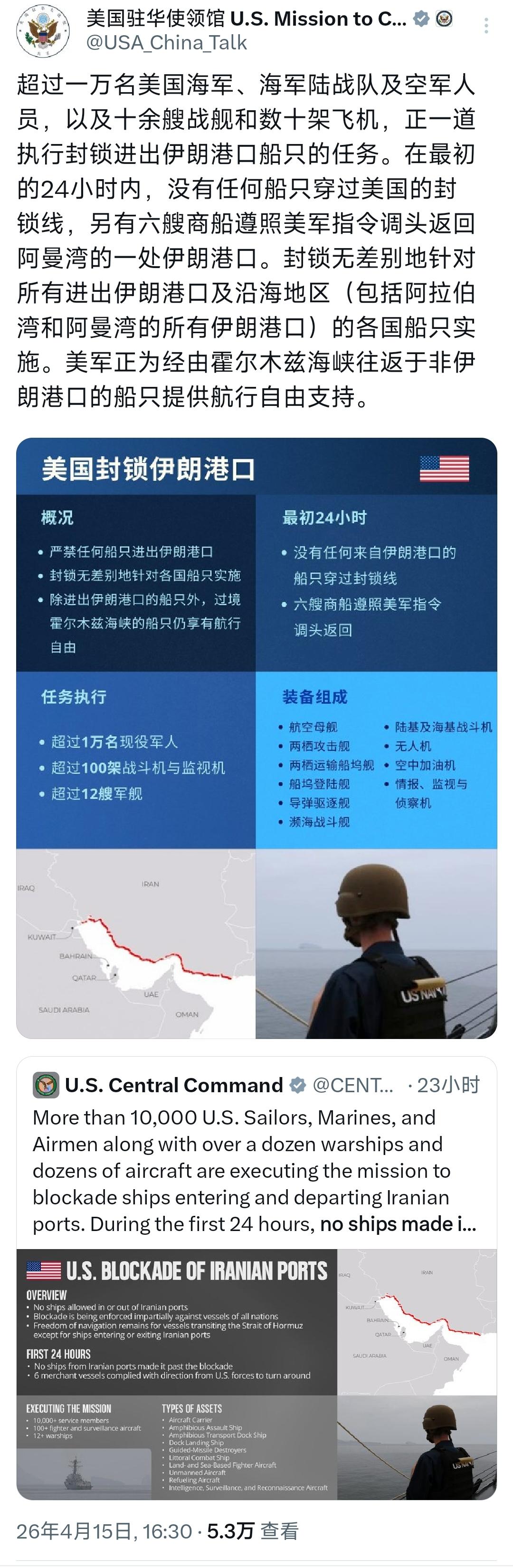 美国驻华使领馆今天(4月15日)写道:“超过一万名美国海军、海军陆战队及空军人员,以及十余艘战舰和数十架飞机,正一道执行封锁进出伊朗港口船只的任务。在最初的24小时内,没有任何船只穿过美国的封锁线,另有六艘商船遵照美军指令调头返回阿曼湾的一处伊朗港口。封锁无差别地针对所有进出伊朗港口及沿海地区(包括阿拉伯湾和阿曼湾的所有伊朗港口)的各国船只实施。美军正为经由霍尔木兹海峡往返于非伊朗港口的船只提供航行自由支持。” [机智]评几句:美方这番封锁伊朗港口的高调宣称,不过是自吹自擂的政治表演,所谓“无差别封锁”“无一船突破”的说辞更是不堪一驳,奉劝美方别再吹牛!查查Kpler等国际海事机构的实时追踪数据便知,封锁生效后多艘驶向中国的油轮早已顺利穿越霍尔木兹海峡,隶属中国企业的“富星号”“穆尔利基山号”更是在美军舰艇附近大摇大摆通行,美方全程噤声未敢拦截。国际媒体也早已披露,伊朗多艘商船依旧按计划进出港口,霍尔木兹海峡通航从未真正中断,所谓6艘商船折返,不过是美方挑拣的片面事实。美方嘴上喊着无差别封锁,究竟真相如何?美国其实心知肚明!美国连基本的海事事实都不敢正视,其所谓“维护航行自由”,不过是为军事施压找的拙劣借口,这场自导自演的封锁闹剧,终究逃不过国际社会的火眼金睛。