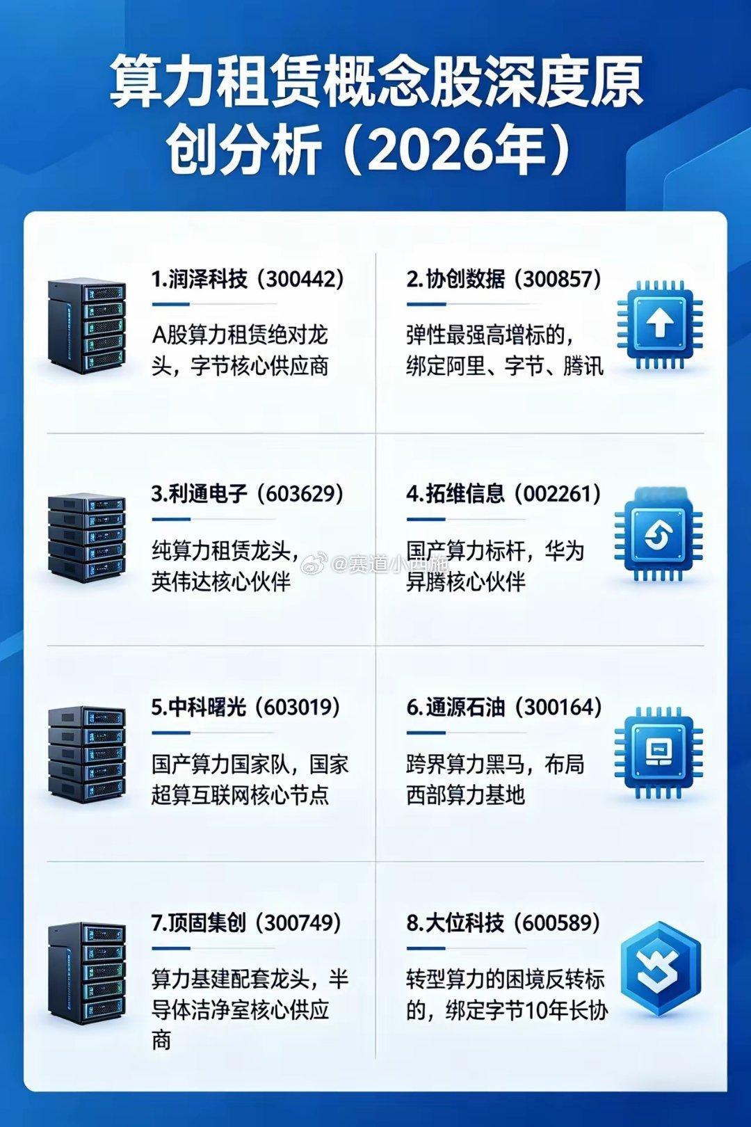 算力需求井喷,算力租赁概念股深度原创分析(2026年)(深度原创·资金视角·全维度拆解)一、行业整体概况:卖方市场确立,高景气持续,龙头强者恒强2026年AI大模型推理爆发、自动驾驶量产落地、云计算全面升级,全球AI算力需求年增超100%,国内高端算力缺口超35%,行业彻底进入卖方市场:高端GPU供不应求、租金持续上涨(H100/H200月租金达5.5–6.6万元,年内涨幅20%–30%),呈现三大核心特征:1. 业绩高增:盈利爆发,毛利率坚挺- 头部企业2025年净利普遍**+150%~+400%,2026年Q1延续80%+高增**- 毛利率稳定30%–45%,高端算力集群超45%,盈利确定性极强2. 空间广阔:千亿赛道,集中度飙升- 2026年国内市场规模突破2600亿元,2026–2028年复合增速50%+- 行业CR5加速破70%,中小厂因缺芯片、缺资金、缺客户快速出清3. 核心壁垒:四大门槛,构筑护城河- 芯片壁垒:稳定H100/H200/昇腾渠道,交付周期排至2027–2028年- 客户壁垒:字节/阿里/腾讯/华为长单锁定(3–5年),出租率100%- 成本壁垒:绿电直供、液冷普及,PUE≤1.2,西部枢纽电价低至0.2–0.3元/度- 规模壁垒:万P级集群、全国节点布局、百亿级融资能力 二、核心龙头个股多维分析(原创·资金视角)1. 润泽科技(300442)——A股算力租赁绝对龙头(稳健标杆)- 板块:计算机·IDC/AI算力租赁- 业绩:2025年净利50–53亿元(+179%~+196%),2026Q1预增超80%;订单排至2027年- 技术:京津冀最大园区级AIDC,PUE≤1.2,全液冷部署,单机柜算力行业领先- 地位:字节核心供应商(收入占比60%),手握60亿长单;全国8大枢纽布局,市占率行业前3- 上涨逻辑:大客户深度绑定+规模持续扩张+绿电成本优势,业绩与估值双击,机构重仓首选2. 协创数据(300857)——弹性最强高增标的(20CM人气王)- 板块:电子·算力租赁/智能算力服务- 业绩:2026Q1净利6.5–8.5亿元(+284%~+402%);2025年净利**+65%+,2026年机构预测+70%+**- 技术:高端GPU池化调度,定制化集群,适配大模型训练/推理- 地位:绑定阿里/字节/腾讯,累计算力采购超322亿元,算力规模快速跻身第一梯队- 上涨逻辑:订单集中释放+轻资产高周转+客户多元化,游资+机构共振,弹性冠绝板块3. 利通电子(603629)——纯算力租赁龙头(规模冠军)- 板块:机械设备·高端算力租赁- 业绩:2026年净利预增超1100%;出租率100%,与腾讯签50亿长单(2025–2027),订单排至2028年- 技术:可调度高端算力超3.3万P(H100/H200为主),PUE行业最优,海外节点完善- 地位:英伟达核心伙伴,国内纯租赁规模第一,稀缺高端算力标的- 上涨逻辑:芯片供给稳定+长单锁定业绩+租金持续上涨,量价齐升,利润弹性最大化4. 拓维信息(002261)——国产算力标杆(华为生态核心)- 板块:计算机·国产AI算力/华为昇腾生态- 业绩:2025年净利预增超160% ,2026Q1延续高增;昇腾订单饱满- 技术:华为昇腾核心合作伙伴 ,国产算力2.0–2.5万P ,适配政务/金融/工业大模型- 地位:国产算力第一股 ,政企客户资源深厚,国产替代核心受益- 上涨逻辑:国产替代加速+政策强加持+订单高增,自主可控主线,安全边际高5. 中科曙光(603019)——国产算力国家队(超算龙头)- 板块:计算机·超算/国产算力租赁- 业绩:2025年净利**+80%+ ;液冷订单48.75亿元**,在手订单超100亿元- 技术:国产DCU领先,液冷技术成熟 ,国家超算互联网核心节点- 地位:国资背景 ,国产算力1.5万P ,深度绑定政企/运营商/科研院所- 上涨逻辑:自主可控+液冷普及+规模扩张,稳健成长,机构长期配置6. 通源石油(300164)——跨界算力黑马(转型反转)- 板块:石油石化·油服/算力租赁转型- 业绩:2026年以来涨幅**+202%** ;算力业务快速落地,业绩扭亏高增- 技术:布局西部算力基地,绿电配套完善,低成本优势显著- 地位:跨界转型标杆,切入头部云厂商供应链,算力规模快速爬坡- 上涨逻辑:转型预期+业绩反转+行业高景气,小市值高弹性,游资偏好7. 顶固集创(300749)——算力基建配套龙头(洁净室刚需)- 板块:电子·半导体洁净室/算力基建- 业绩:2026年以来涨幅**+198% ;AI芯片厂/智算中心扩产驱动洁净室需求爆发**- 技术:半导体洁净室核心供应商,适配高算力中心高洁净、低振动要求- 地位:绑定头部芯片厂 ,订单饱满,业绩扭亏高增- 上涨逻辑:算力基建刚需+业绩改善+估值修复,赛道配套隐形冠军 三、投资主线与风险提示(原创总结)核心投资主线(2026年)1. 纯算力租赁龙头:利通电子、润泽科技(业绩最确定、租金最受益)2. 高弹性小票:协创数据、通源石油(增速最快、资金关注度最高)3. 国产替代主线:拓维信息、中科曙光(政策加持、安全边际高)4. 基建配套:顶固集创(需求刚性、业绩反转)关键风险提示- 芯片供给波动:美国出口管制、英伟达产能不及预期- 租金回落风险:2027年后国产芯片放量、供给缓解- 竞争加剧:云厂商自建算力、行业新进入者增多- 政策变化:能耗指标、补贴政策、数据合规趋严免责声明:本文为基于公开数据的原创行业分析,不构成任何投资建议。市场有风险,投资需谨慎,请结合自身风险承受能力理性决策。