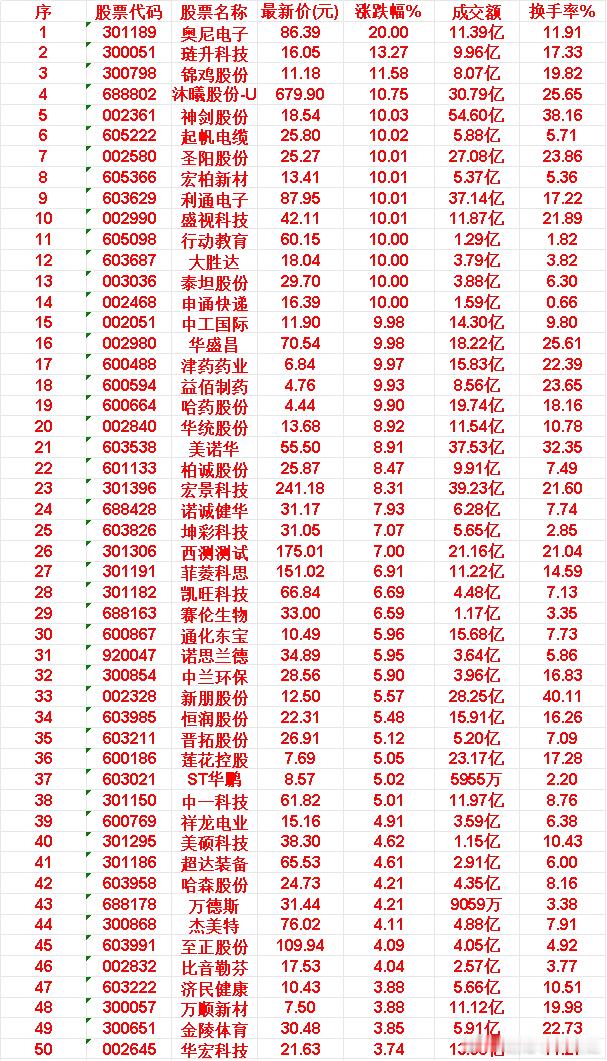 奥尼电子:最新价 86.39 元,涨跌幅 +20.00%琏升科技:最新价 16.05 元,涨跌幅 +13.27%锦鸡股份:最新价 11.18 元,涨跌幅 +11.58%沐曦股份-U:最新价 679.90 元,涨跌幅 +10.75%神剑股份:最新价 18.54 元,涨跌幅 +10.03%起帆电缆:最新价 25.80 元,涨跌幅 +10.02%