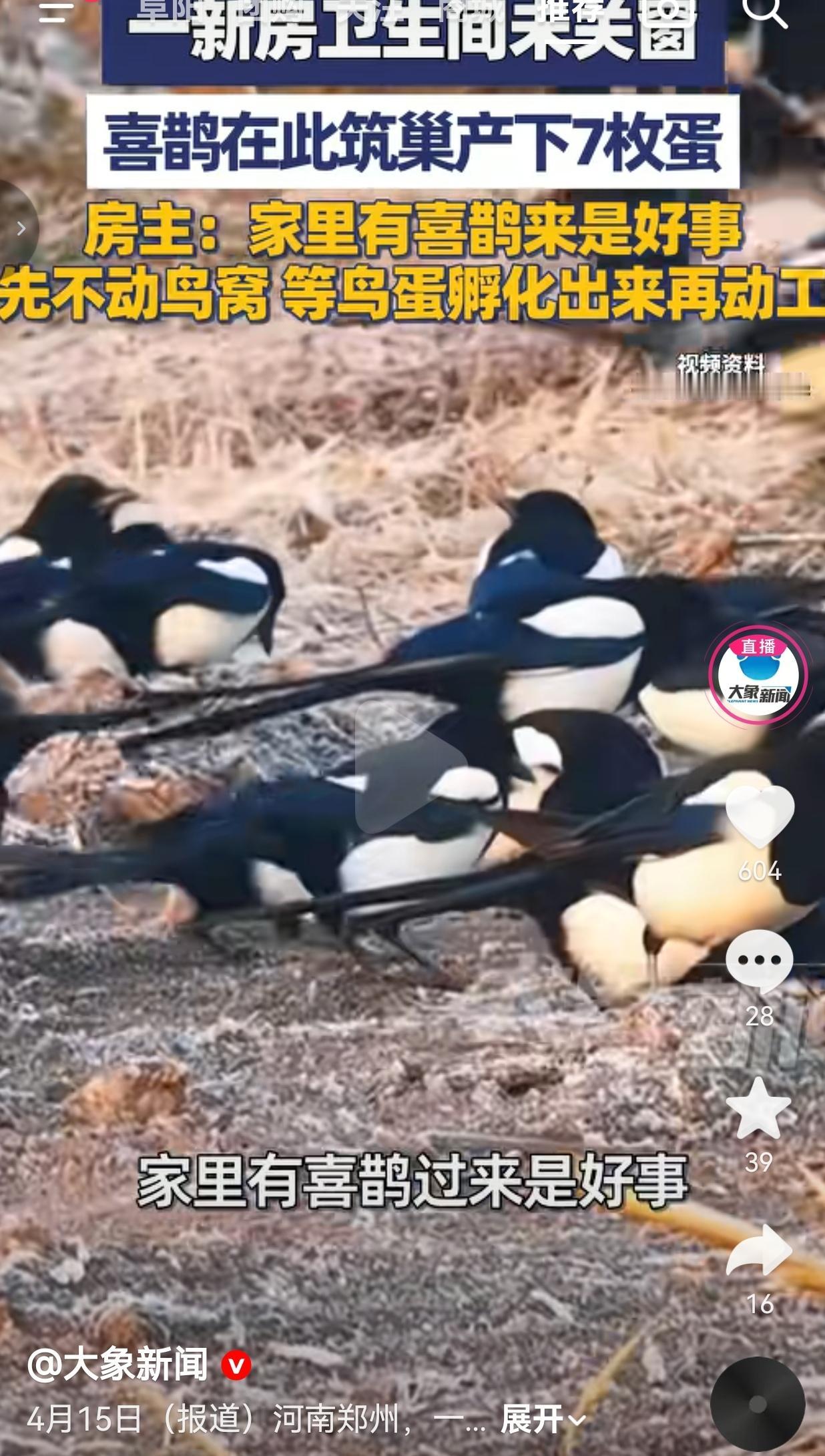 近日,河南郑州一套正在装修的新房里,发生了一件超暖心的事。 装修工人夏先生上门施工,一进卫生间就愣住了:窗户没关,窗台上居然搭了一个超大的喜鹊窝,枝桠交错、结构完整,窝里安安稳稳躺着7枚淡蓝色的喜鹊蛋! 原来,房主装修期间没关卫生间窗户,一对喜鹊直接把这里当成了安全的家,不仅筑了巢,还顺利产下了蛋。 夏先生当场就联系了房主,把情况一五一十说明白。 房主听完,没有丝毫犹豫,直接拍板:先别动这个鸟窝,等鸟蛋全部孵化、小鸟飞走之后,再动工装修! 房主说,喜鹊来家里是好事,是吉祥的象征,自己运气好才遇上这种事,绝对不能打扰它们一家。哪怕装修延期,也绝不能伤害这些小生命。 网友看到后评论说:这房主太有爱心了!为了小鸟暂缓装修,格局直接拉满! 也有的网友说:喜鹊是报喜鸟,能来家里筑巢说明房主心善!这才是真正的人与自然和谐相处! 还有的网友说:换我我也这么干!装修晚几天没事,小生命只有一次,必须守护! 更有网友表示:太治愈了!看完这个新闻,一天的坏心情都没了,这才是生活里的小美好! 说实话,我看完这新闻,心里又暖又感慨。 现在多少人,为了赶工期、为了自己方便,别说一个鸟窝,就是路边的小动物,都能说赶就赶、说伤就伤。可这位房主,明明是自己的房子、自己的装修进度,却因为一窝喜鹊蛋,心甘情愿推迟计划,只为守护7个小生命。 这不是傻,是刻在骨子里的善良,是对生命最基本的敬畏! 喜鹊选在这里筑巢,是信任;房主选择暂缓装修,是善意。这份双向的温柔,才是这个时代最难得的东西。 我们总说要发展、要效率,可别忘了,人和自然从来不是对立的。给小动物留一点空间,给生命多一份尊重,我们的生活才会更有温度。 这位房主用行动告诉我们:真正的好运,从来不是等来的,是用善良换来的。你善待生命,生活才会善待你。 喜鹊衔枝筑巢,是对人类的信任;房主暂缓装修,是对生命的守护。 这件小事,没有惊天动地的情节,却藏着最动人的善意。 它提醒着我们:在追求生活便利的同时,永远不要忘记对生命的敬畏,永远不要丢掉心底的温柔。 愿我们都能像这位房主一样,对万物心怀善意,给生命留足空间,让每一个小生命,都能在这个世界上,安稳筑巢、顺利成长。 最后,我想说的是:心有善意,万物皆安;尊重生命,好运自来!