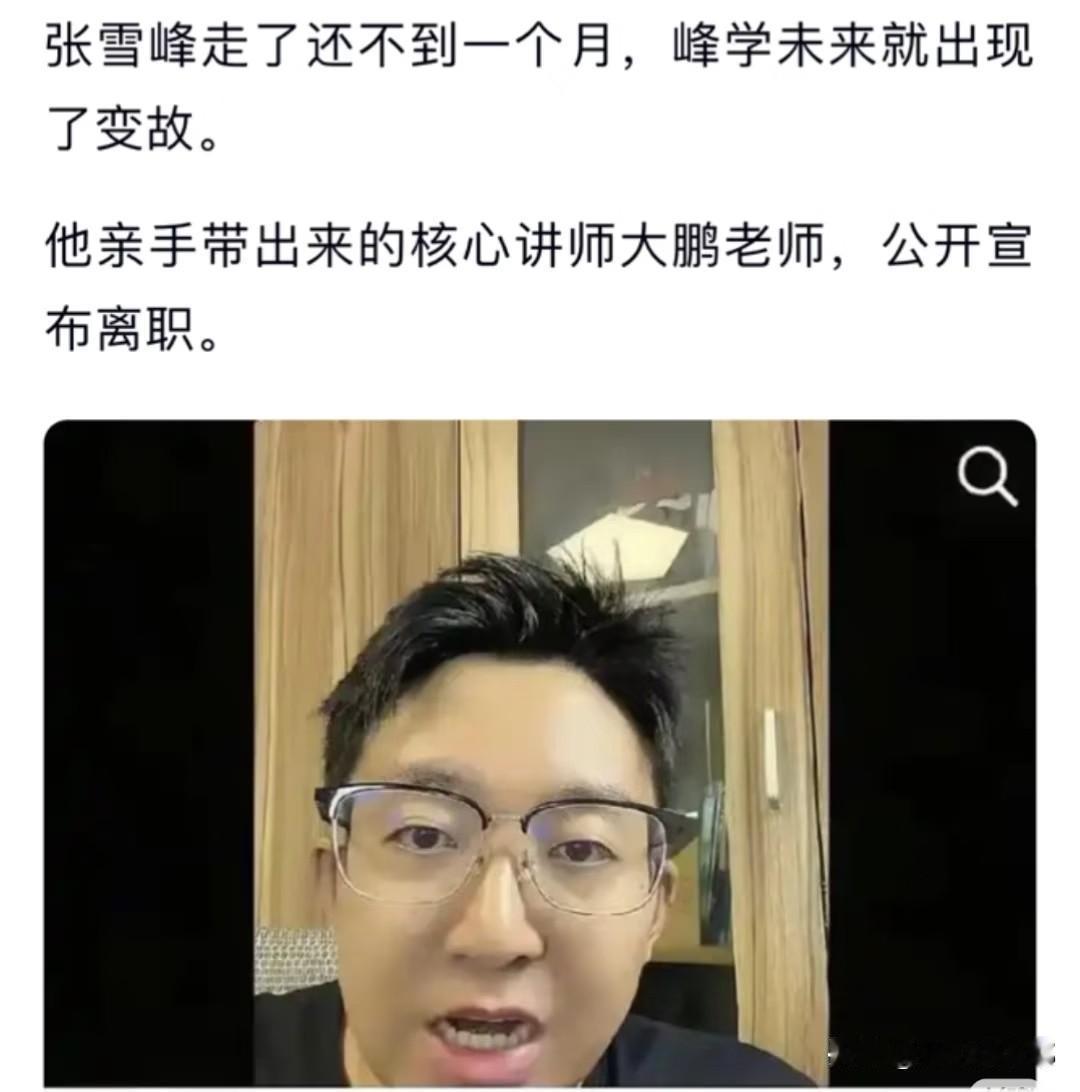 想过峰学蔚来会有人走, 但没想到头一个是大鹏老师。 大鹏是张雪峰的铁杆粉丝,当初就是冲着他,才带着妻子从北京搬到苏州。 刚进公司那会儿,组长不重用他。花了一个月做的200多页的教学方案交上去,根本没人搭理。 他蹲公司堵半夜下播的张雪峰,亲手把方案交给他。 张雪峰把200多页的高中数学教学方案一页一页看了一个多小时,当下拍板,让他负责数学录播课,才有了今天的他。 现在,张雪峰离开不到20天,他就离职了。 他的离职绝不是对张雪峰的背叛,恰恰相反,他只服张雪峰。 但这时候离开,作为峰学的核心老师,确实让峰学难堪,也让武亮下不了台,还让自己背上骂名。 也许悄悄地走,大家都体面。