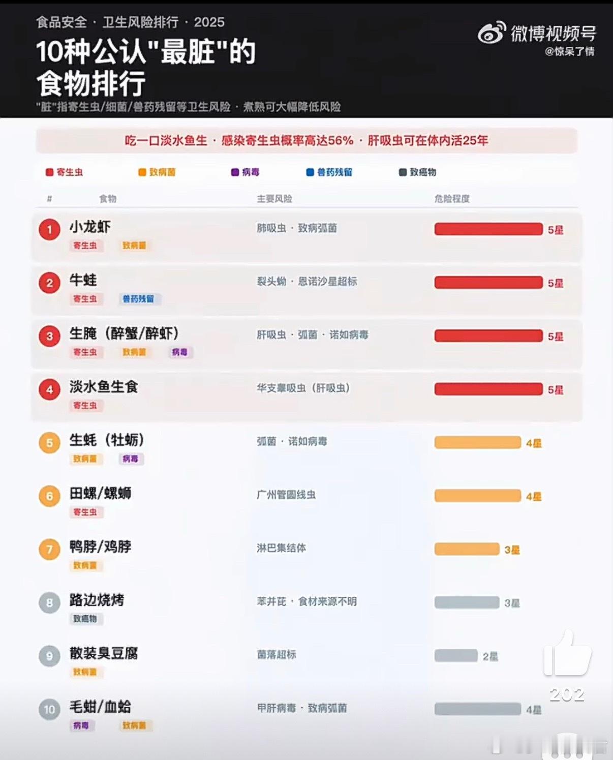 是最脏排行榜不是必吃榜小龙虾、牛蛙、生腌、淡水鱼生食、生蚝、田螺、鸭脖/鸡脖、路边烧烤、散装臭豆腐和血蛤10种食物上榜。