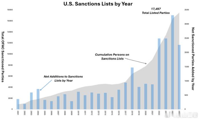 美国霸权实力不断衰减。当前,美国经济、政治、社会多重危机交织,对外制裁能力与全球掌控力持续削弱,难以继续维持高强度的金融垄断格局。美元在全球外汇储备中的占比,已从1999年的71%跌至2025年底的57%,大宗商品非美元计价比例突破35%,“石油美元”的根基正加速松动。同时,制裁本身也陷入“泛滥困境”。自特朗普执政以来,美国实施的制裁已超过17000项,这种泛滥式制裁导致目标分散、执行效能大幅下滑。历年受美国制裁的实体总数。