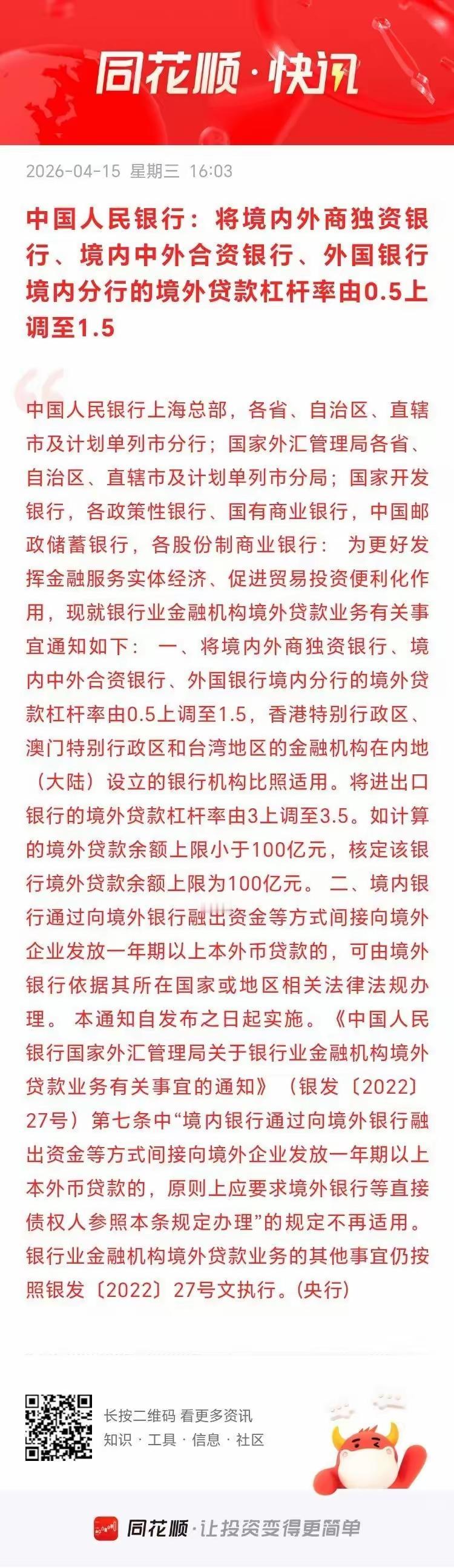 盘后央行这记大招,直接给市场注入了一剂强心针——外资银行境外贷款杠杆率从0.5提到1.5,翻了3倍,这力度够猛。 别觉得这是银行的事跟股市没关系。杠杆率一提,外资银行能放的贷款规模直接扩大,企业融资更方便了。不管是搞外贸的、做实业的,还是搞创新研发的,手里能拿到更多资金,经营底气就足了,业绩上去了,上市公司股价自然有支撑。 说白了,这就是在给外资机构递“橄榄枝”。鼓励他们来中国扩大业务,放贷规模大了,外资参与中国市场的深度就会增加。现在国际局势复杂,咱们主动打开空间,让更多外资愿意进来、愿意扎根,这本身就是对市场信心的大提振。 最近A股总有点“冲高回落”的小毛病,外围一涨咱们高开,然后就有人趁机兑现。但这次不一样,央行这步棋针对性很强,就是从资金端给市场托底。企业融资成本低了、渠道多了,相当于给经济基本面添了把火,股市作为经济的晴雨表,没理由不跟着受益。 有人可能担心,这消息会不会又是“一日游”?但看这调整幅度——3倍的杠杆提升,不是小打小闹,是实打实的政策支持。尤其是对那些依赖外资合作、有跨境融资需求的行业,比如高端制造、外贸企业、科技创新领域,这就是直接的利好。 再看看当前市场,成交量逼近2.5万亿,资金本来就在找方向。之前高位科技股有分歧,资金在高低切,现在有了政策托底,那些真正有业绩支撑的成长股,可能会被更多资金盯上。 明天开盘,估计不少板块会有反应。银行、券商作为资金通道,可能先动一动;而那些依赖融资扩张的行业,比如半导体、新能源、高端装备,后续潜力更大。当然,也别指望一口吃成胖子,市场情绪修复需要时间,但至少这颗“定心丸”够实在。 记住,政策的发力往往比短期波动更重要。这次杠杆率调整,背后是“稳外资、促发展”的明确信号,对A股来说,这比偶尔的高开低走影响深远多了。明天能不能修复上涨不好说,但至少市场底气更足了,这就够了。 你觉得哪些行业会最先尝到这波政策的甜头?